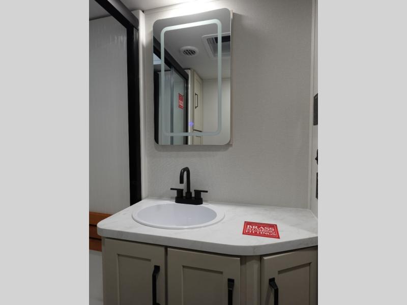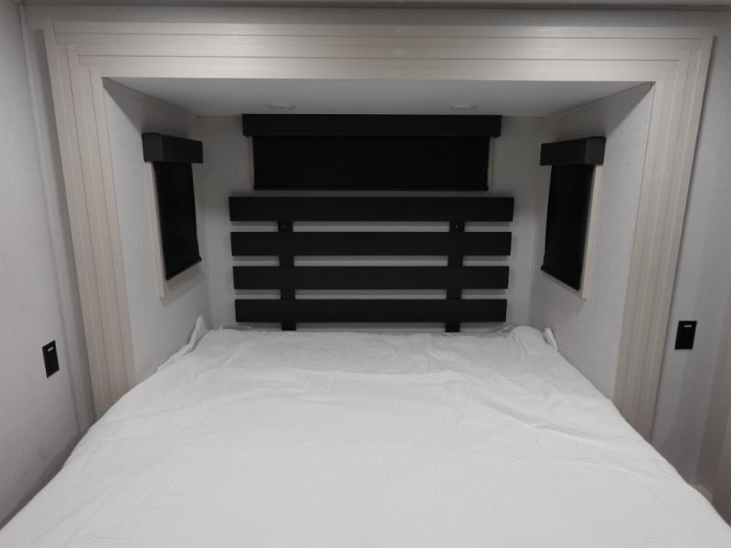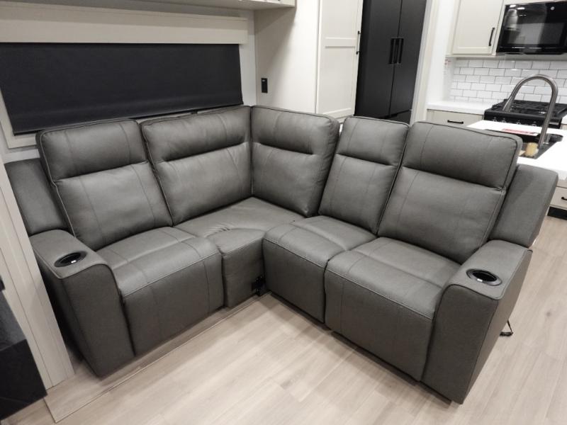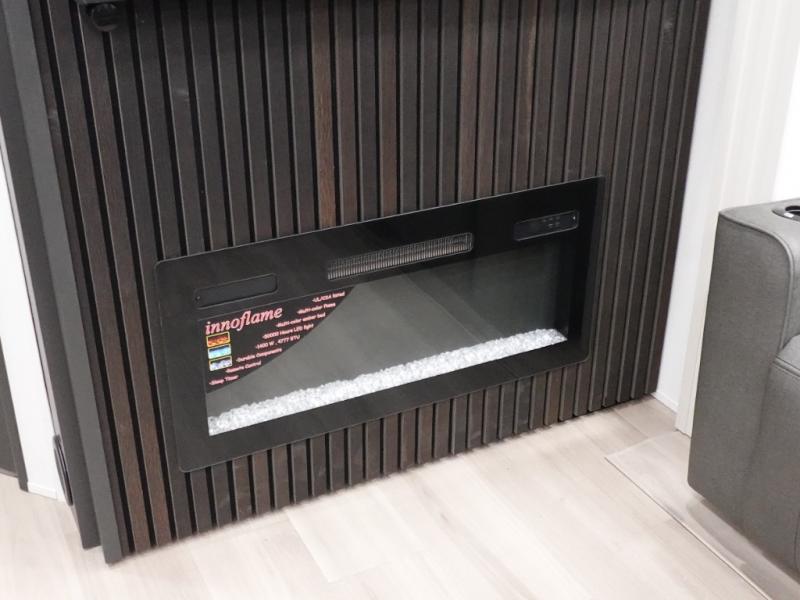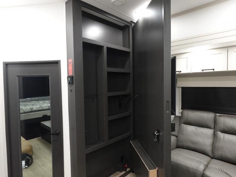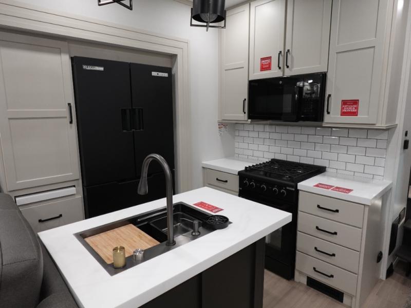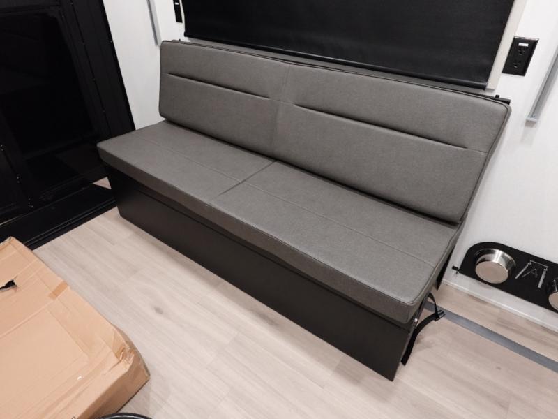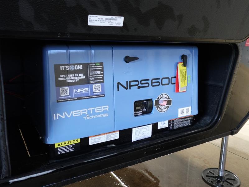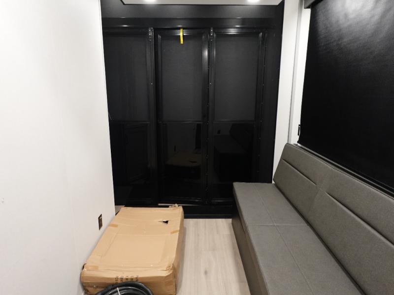 This toy hauler has all the comfort and convenience you could ask for! Once you have unloaded your toys from the 12' 6" separate garage, you can start lunch on the exterior griddle located by the side patio. There is also a 65" TV here and a 1.7 cu. ft. refrigerator to entertain guests! If the weather isn't cooperating, you can make meals in the fully equipped interior kitchen, complete with an island, pantry, pull-out countertop extension and more. An L-shaped sofa with recliners is in perfect view of the 50" TV and fireplace, and there is even a hybrid desk/dinette with windows where you can get some work done if needed. Head towards the front to freshen up in the full bath before heading to bed in the private bedroom. Here, you'll find a king bed slide out, a large closet with washer and dryer prep, plus a dresser with TV prep if you want the option to watch movies in bed!
