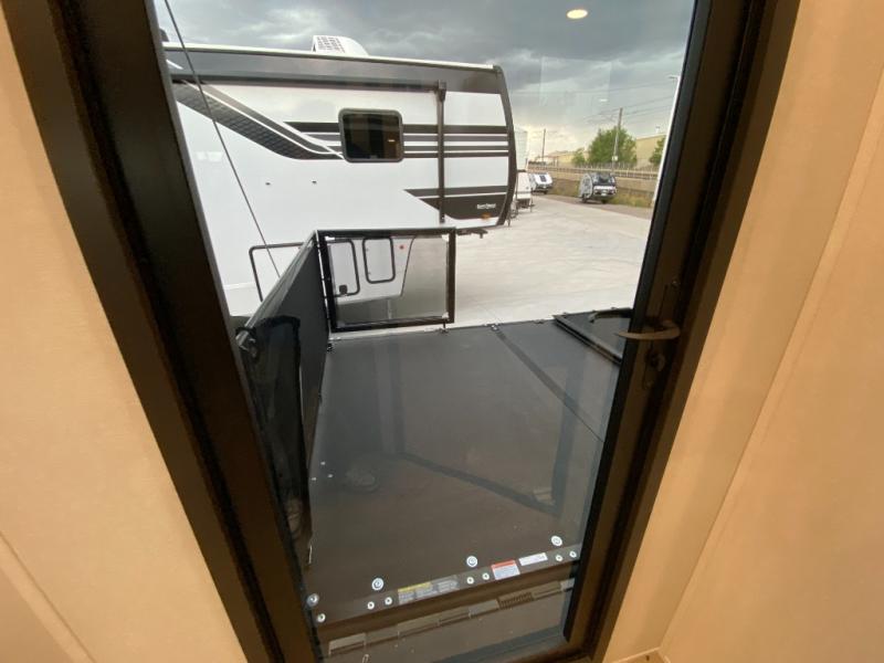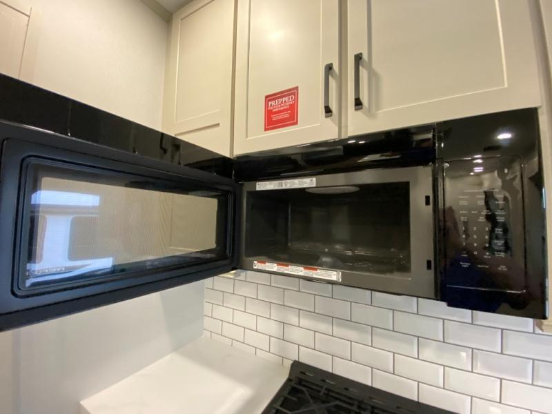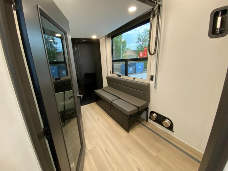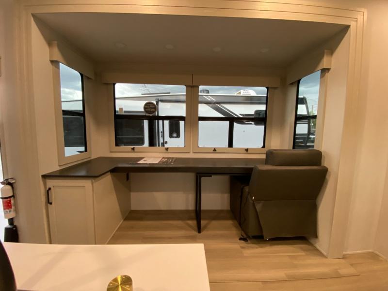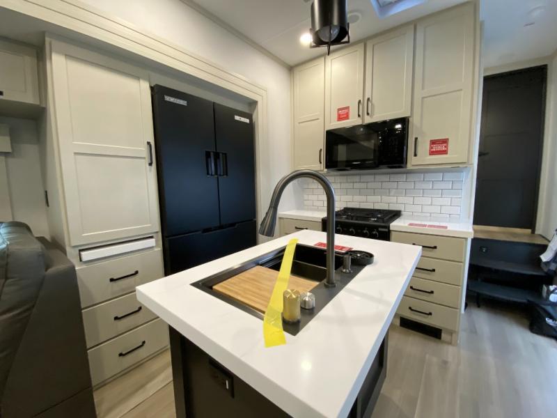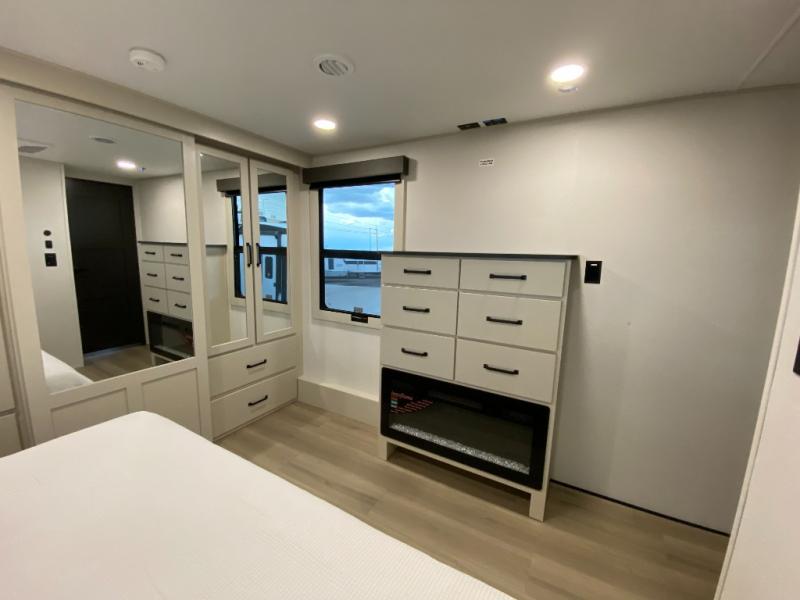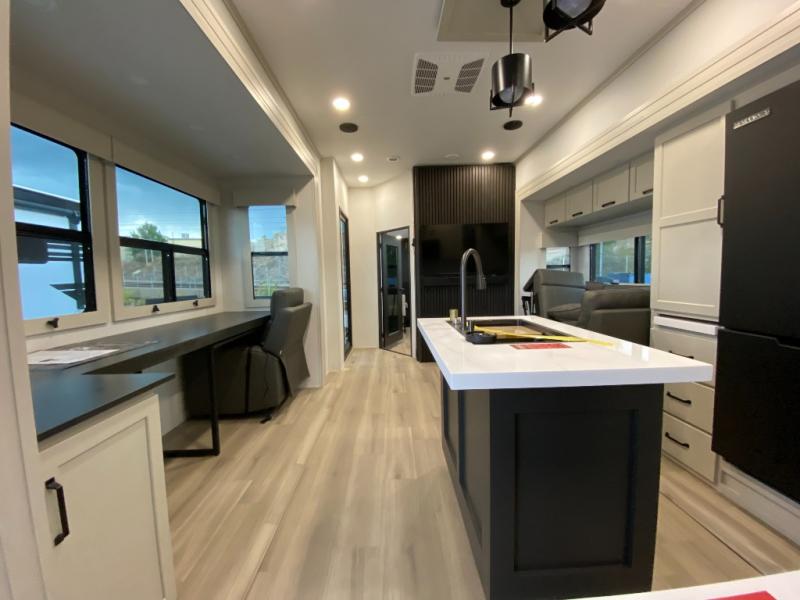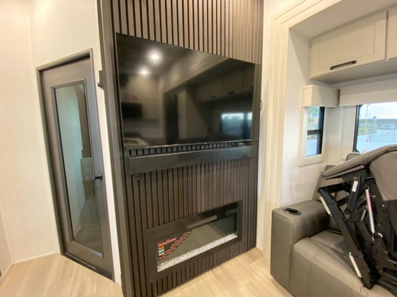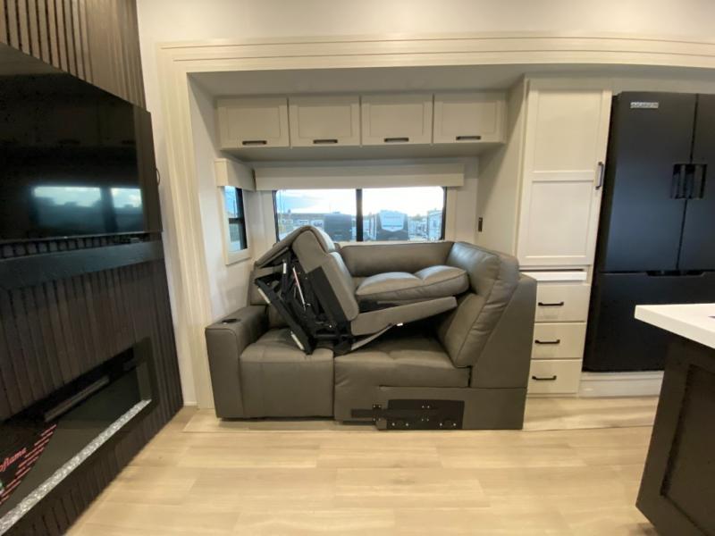This toy hauler has all the comfort and convenience you could ask for! Once you have unloaded your toys from the 12' 6" separate garage, you can start lunch on the exterior griddle located by the side patio. There is also a 65" TV here and a 1.7 cu. ft. refrigerator to entertain guests! And if you have guests staying over, you can choose to add the optional Liftsuite system with underside can lights in the garage. If the weather isn't cooperating, you can make meals in the fully equipped interior kitchen, complete with an island, pantry, pull-out countertop extension and more. An L-shaped sofa with recliners is in perfect view of the 50" TV and fireplace, and there is even a hybrid desk/dinette with windows where you can get some work done if needed. Head towards the front to freshen up in the full bath before heading to bed in the private bedroom. Here, you'll find a queen bed slide out with an optional king bed, a large closet with washer and dryer prep, plus a dresser with TV prep if you want the option to watch movies in bed!