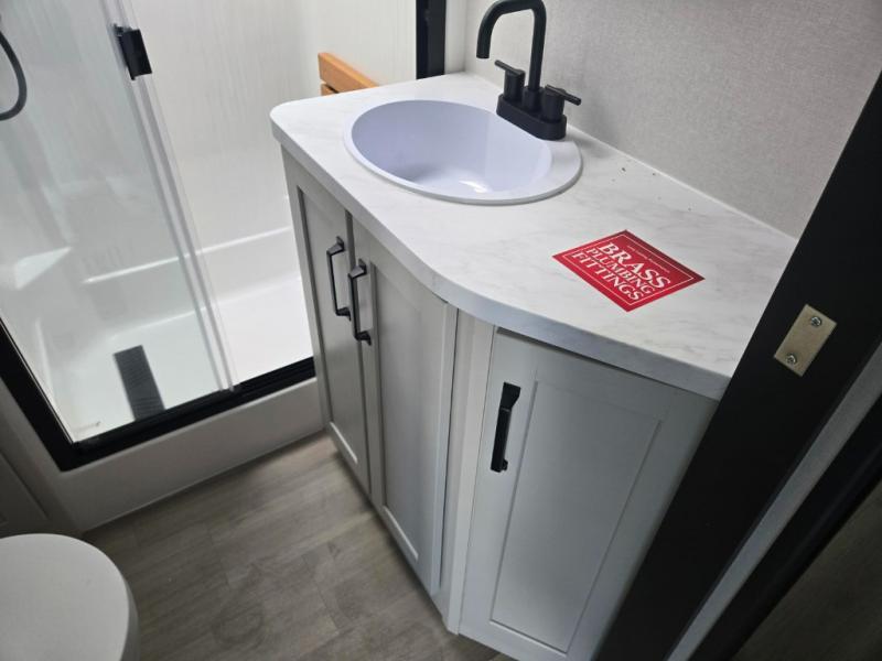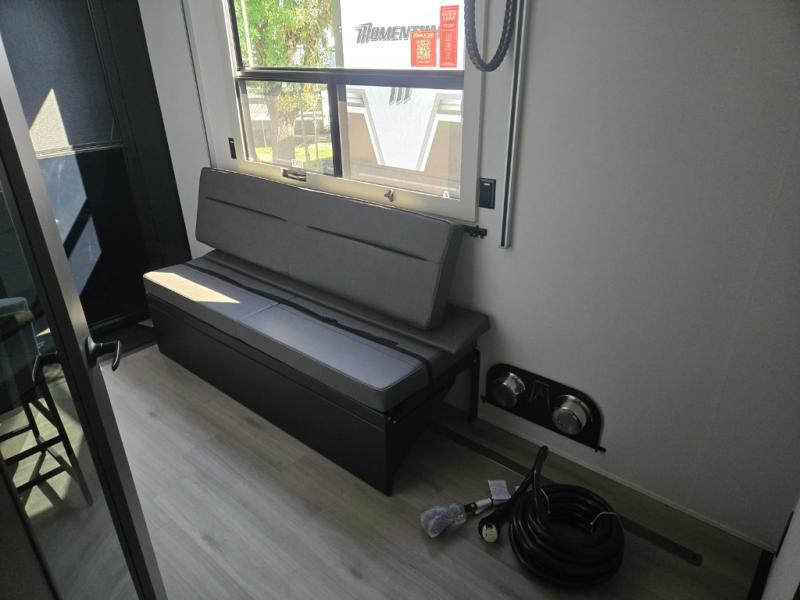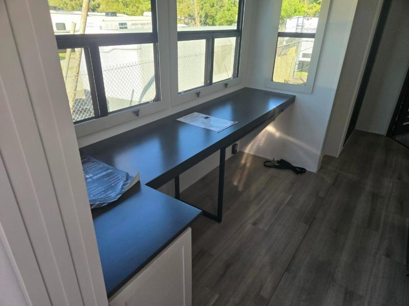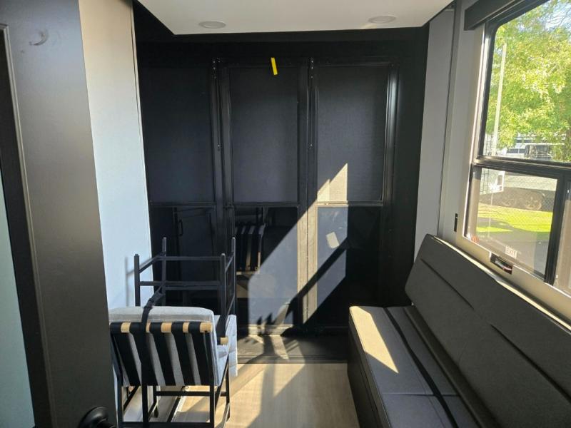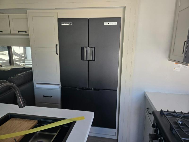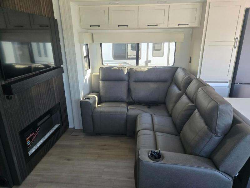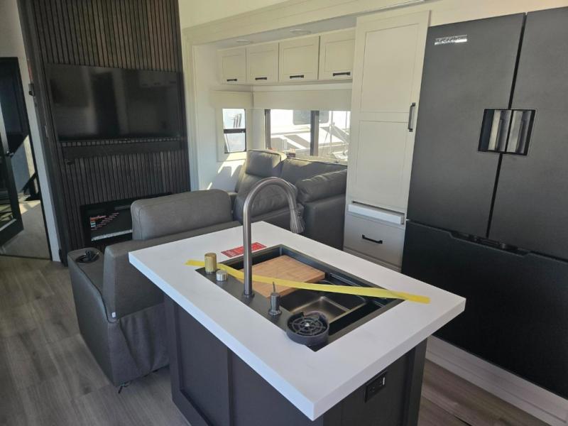 This toy hauler has all the comfort and convenience you could ask for! Once you have unloaded your toys from the 12' 6" separate garage, you can start lunch on the exterior griddle located by the side patio. There is also a 65" TV here and a 1.7 cu. ft. refrigerator to entertain guests! And if you have guests staying over, you can choose to add the optional Liftsuite system with underside can lights in the garage. If the weather isn't cooperating, you can make meals in the fully equipped interior kitchen, complete with an island, pantry, pull-out countertop extension and more. An L-shaped sofa with recliners is in perfect view of the 50" TV and fireplace, and there is even a hybrid desk/dinette with windows where you can get some work done if needed. Head towards the front to freshen up in the full bath before heading to bed in the private bedroom. Here, you'll find a queen bed slide out with an optional king bed, a large closet with washer and dryer prep, plus a dresser with TV prep if you want the option to watch movies in bed!