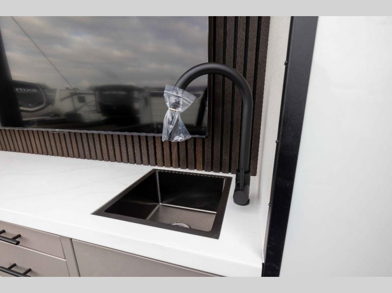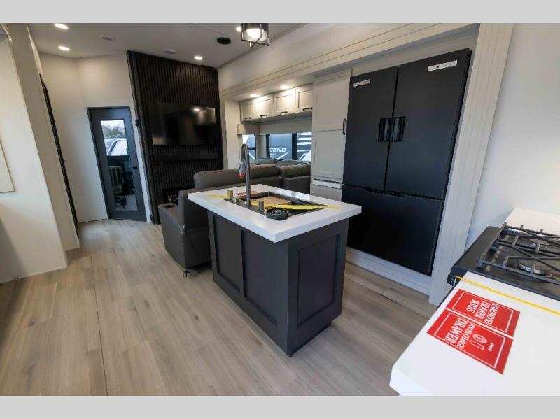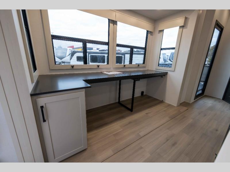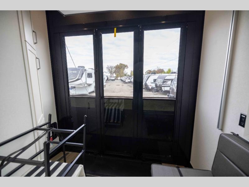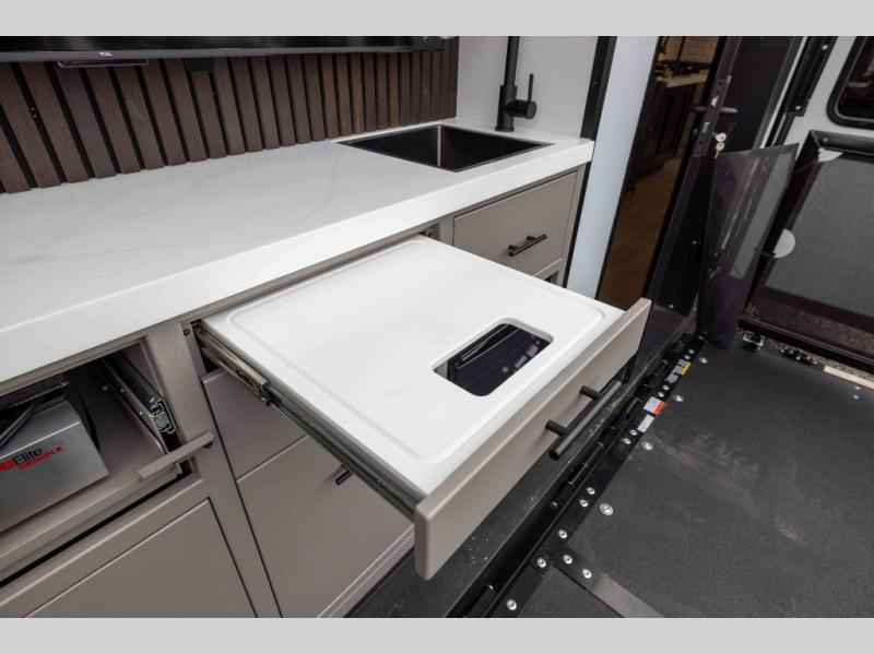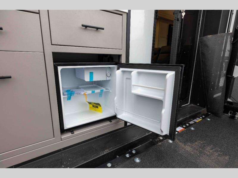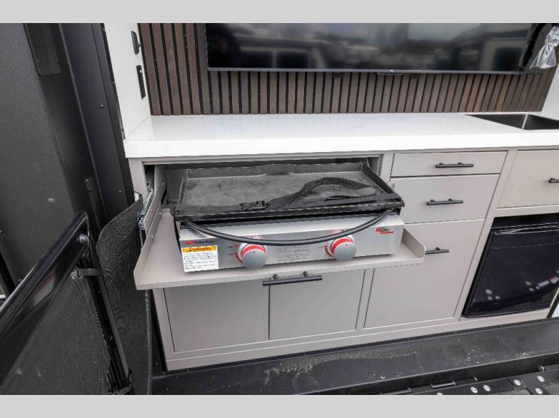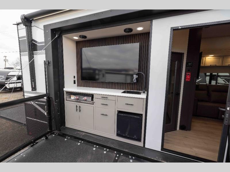 This toy hauler has all the comfort and convenience you could ask for! Once you have unloaded your toys from the 12' 6" separate garage, you can start lunch on the exterior griddle located by the side patio. There is also a 65" TV here and a 1.7 cu. ft. refrigerator to entertain guests! And if you have guests staying over, you can choose to add the optional Liftsuite system with underside can lights in the garage. If the weather isn't cooperating, you can make meals in the fully equipped interior kitchen, complete with an island, pantry, pull-out countertop extension and more. An L-shaped sofa with recliners is in perfect view of the 50" TV and fireplace, and there is even a hybrid desk/dinette with windows where you can get some work done if needed. Head towards the front to freshen up in the full bath before heading to bed in the private bedroom. Here, you'll find a queen bed slide out with an optional king bed, a large closet with washer and dryer prep, plus a dresser with TV prep if you want the option to watch movies in bed!
