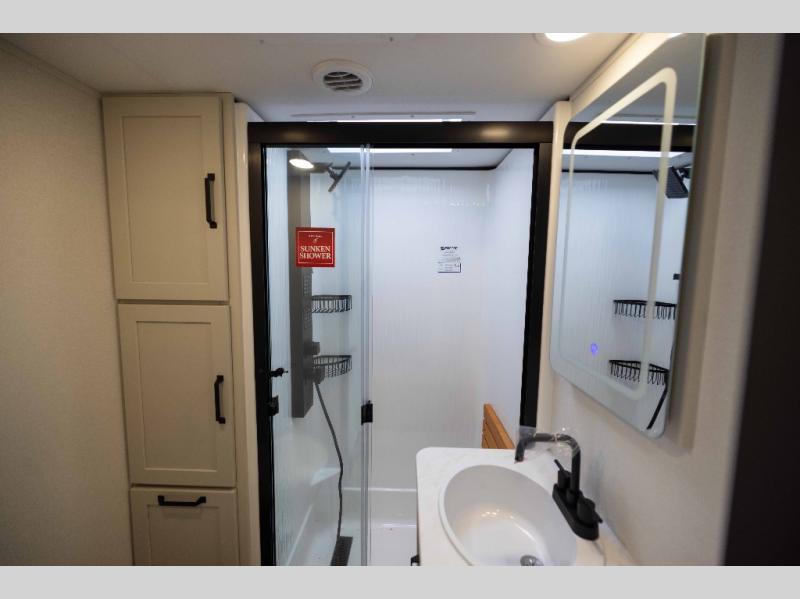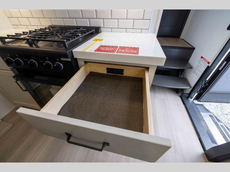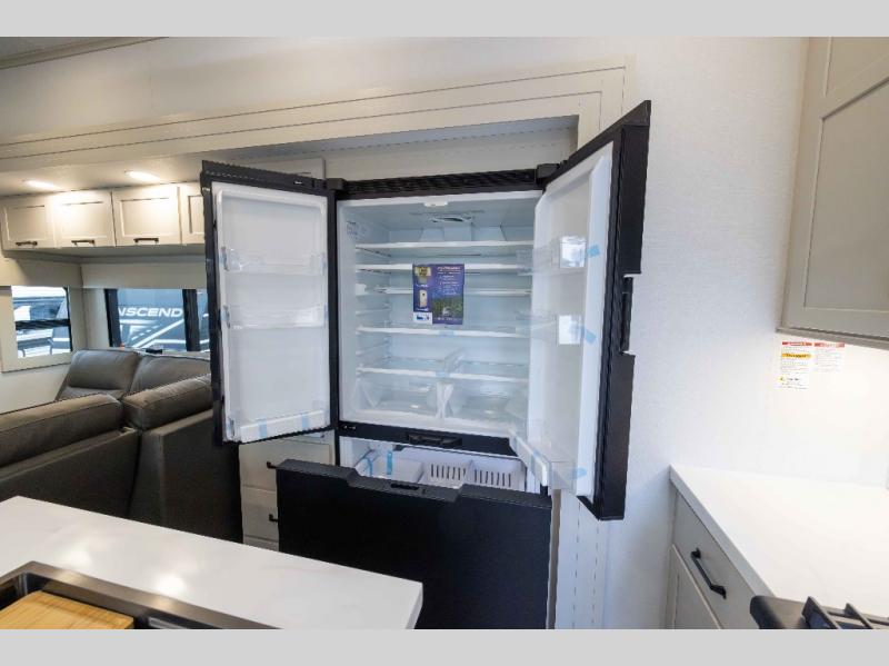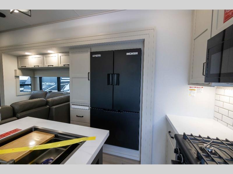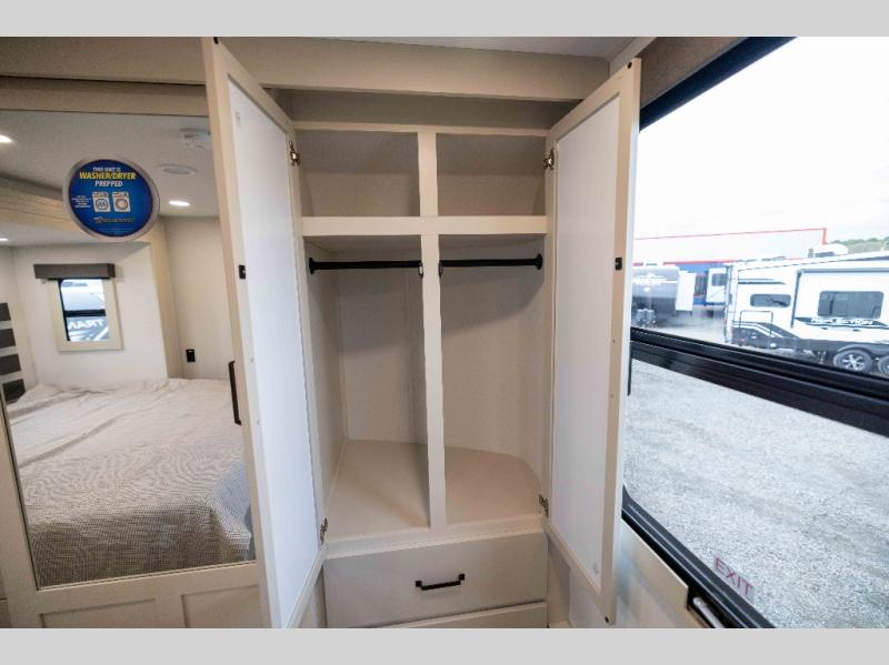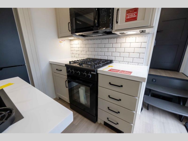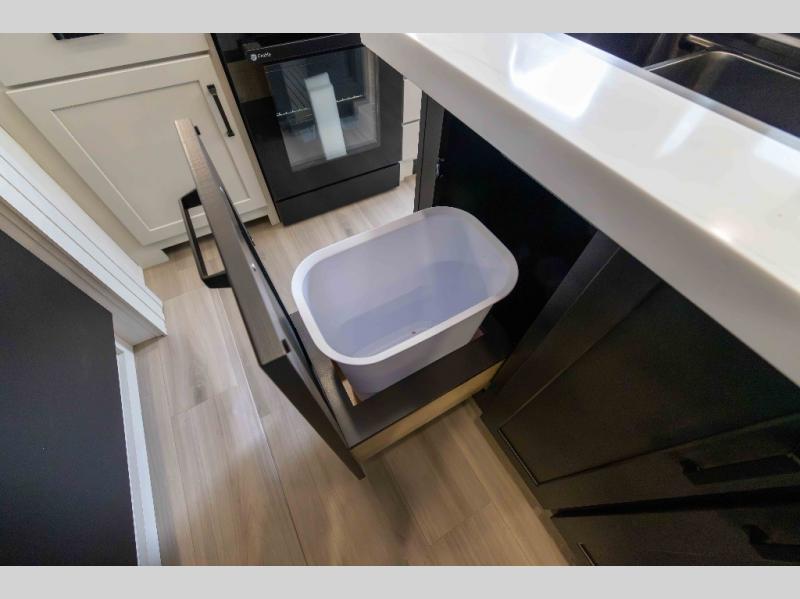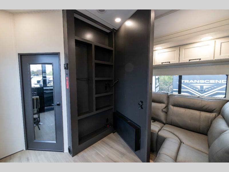 This toy hauler has all the comfort and convenience you could ask for! Once you have unloaded your toys from the 12' 6" separate garage, you can start lunch on the exterior griddle located by the side patio. There is also a 65" TV here and a 1.7 cu. ft. refrigerator to entertain guests! And if you have guests staying over, you can choose to add the optional Liftsuite system with underside can lights in the garage. If the weather isn't cooperating, you can make meals in the fully equipped interior kitchen, complete with an island, pantry, pull-out countertop extension and more. An L-shaped sofa with recliners is in perfect view of the 50" TV and fireplace, and there is even a hybrid desk/dinette with windows where you can get some work done if needed. Head towards the front to freshen up in the full bath before heading to bed in the private bedroom. Here, you'll find a queen bed slide out with an optional king bed, a large closet with washer and dryer prep, plus a dresser with TV prep if you want the option to watch movies in bed!