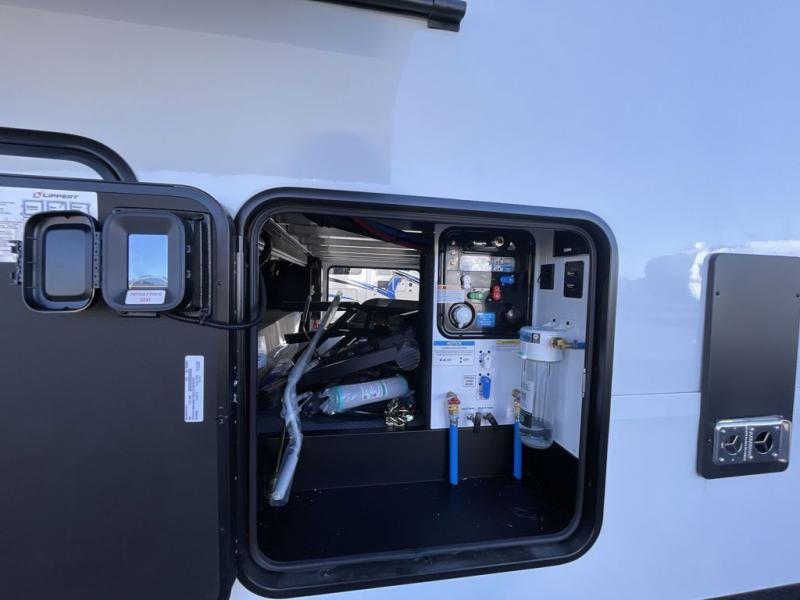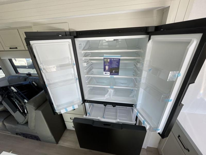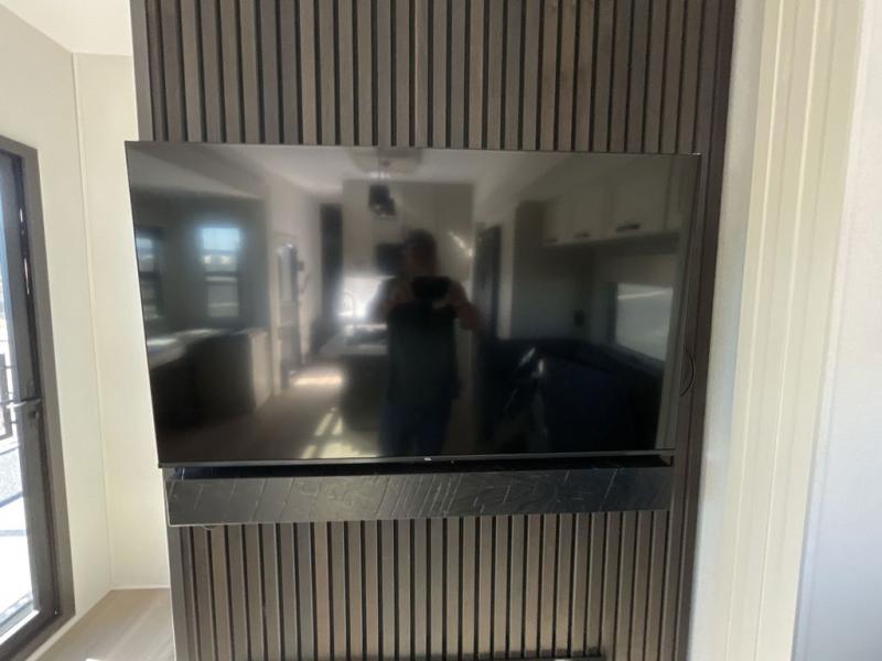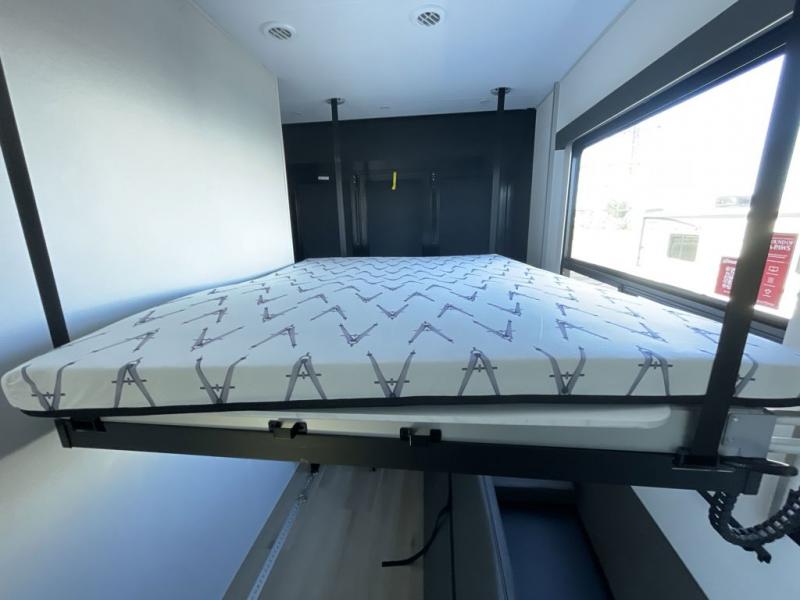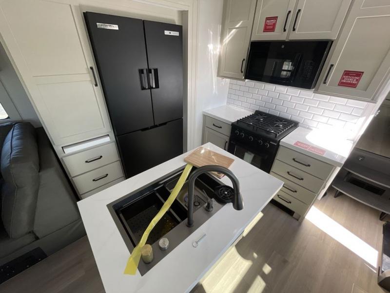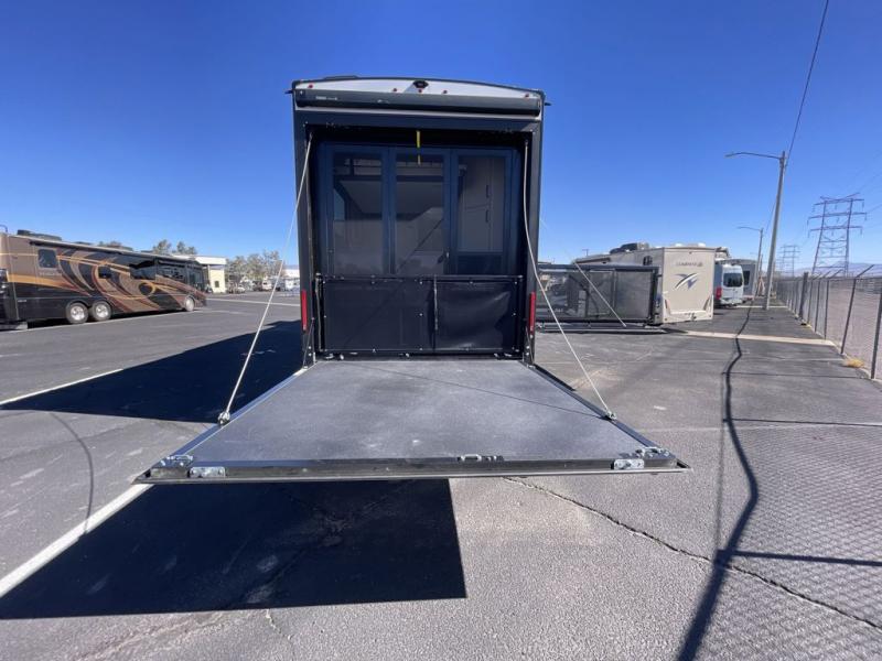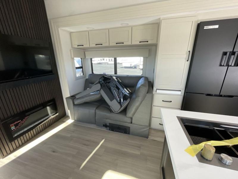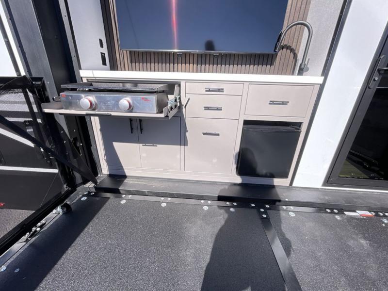 This toy hauler has all the comfort and convenience you could ask for! Once you have unloaded your toys from the 12' 6" separate garage, you can start lunch on the exterior griddle located by the side patio. There is also a 65" TV here and a 1.7 cu. ft. refrigerator to entertain guests! And if you have guests staying over, you can choose to add the optional Liftsuite system with underside can lights in the garage. If the weather isn't cooperating, you can make meals in the fully equipped interior kitchen, complete with an island, pantry, pull-out countertop extension and more. An L-shaped sofa with recliners is in perfect view of the 50" TV and fireplace, and there is even a hybrid desk/dinette with windows where you can get some work done if needed. Head towards the front to freshen up in the full bath before heading to bed in the private bedroom. Here, you'll find a queen bed slide out with an optional king bed, a large closet with washer and dryer prep, plus a dresser with TV prep if you want the option to watch movies in bed!