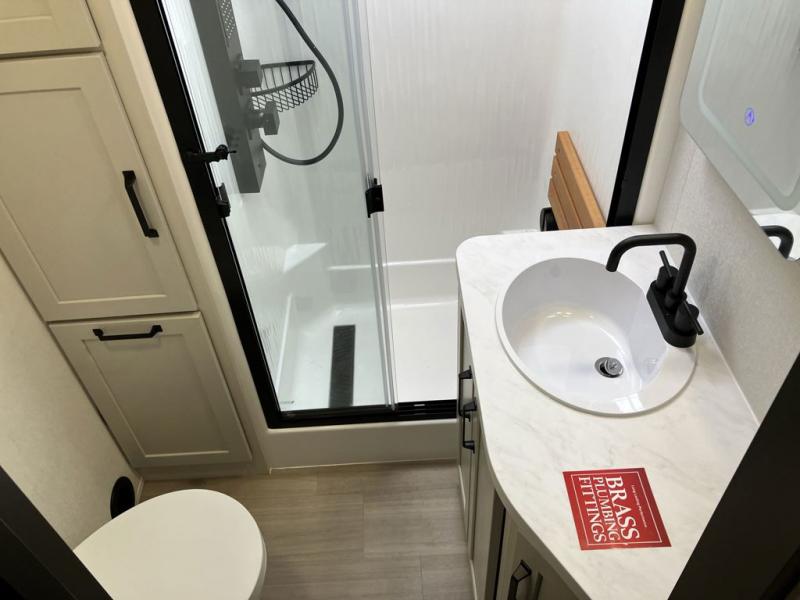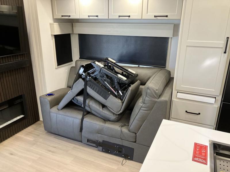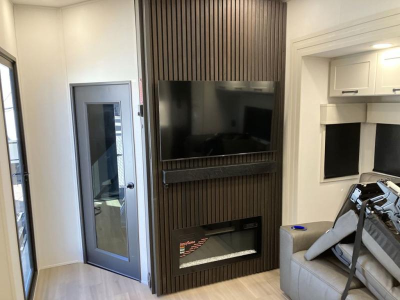 This toy hauler has all the comfort and convenience you could ask for! Once you have unloaded your toys from the 12' 6" separate garage, you can start lunch on the exterior griddle located by the side patio. There is also a 65" TV here and a 1.7 cu. ft. refrigerator to entertain guests! And if you have guests staying over, you can choose to add the optional Liftsuite system with underside can lights in the garage. If the weather isn't cooperating, you can make meals in the fully equipped interior kitchen, complete with an island, pantry, pull-out countertop extension and more. An L-shaped sofa with recliners is in perfect view of the 50" TV and fireplace, and there is even a hybrid desk/dinette with windows where you can get some work done if needed. Head towards the front to freshen up in the full bath before heading to bed in the private bedroom. Here, you'll find a queen bed slide out with an optional king bed, a large closet with washer and dryer prep, plus a dresser with TV prep if you want the option to watch movies in bed!