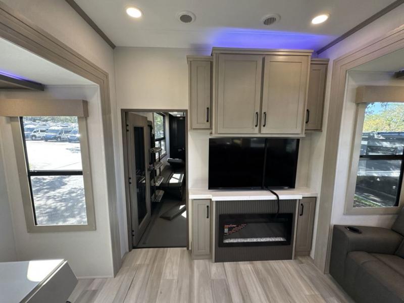 Any time spent in this spacious toy hauler will be time well spent! The 14' garage includes a Liftsuite system, an overhead loft bed and a flip-up pet dish for your furry friends. Once you enter in the main living area, you can relax on the L-shaped sofa with recline across from the fireplace, and there is a free-standing dinette if you want to play a game or two. The chef of your group will love the generous counter space in the kitchen, and the dual entry bath will let everyone stay clean throughout your trip! Head to the front master bedroom to enjoy the queen bed slide out with an optional king bed, a slide top dresser with TV prep, plus a large front closet, complete with washer and dryer prep!