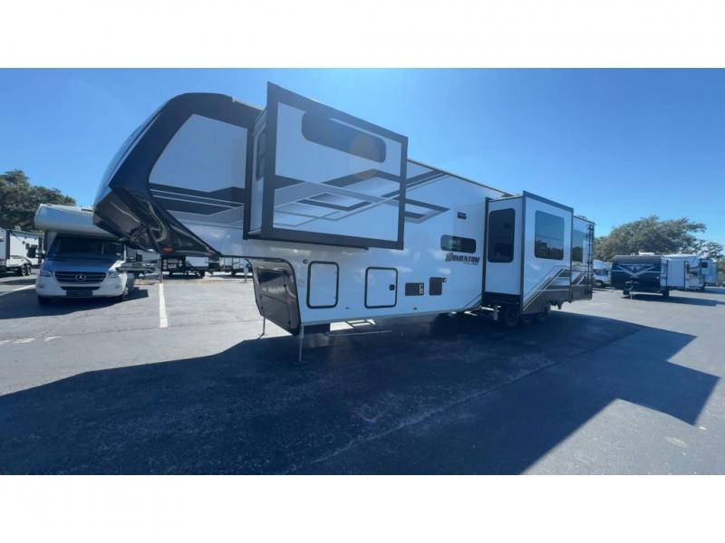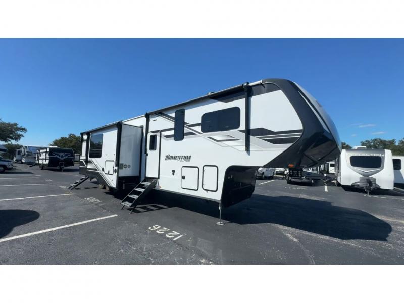 The Momentum fifth wheel toy haulers by Grand Design are built for four seasons of travel with your off-road toys and include luxurious accommodations throughout for extreme living! Each is constructed to a superior standard with the fully enclosed and heated underbelly and storage area, the 5-sided aluminum cage, and the triple insulated garage floor. The MORryde CRE3000 suspension system and rubber pin box, plus the upgraded axle hangers provide the performance and smooth towing you desire, while the interior offers luxury such as color changing LED accent lighting, hardwood cabinet doors with hidden hinges, and a central vacuum system. Each toy hauler also includes four packages, including the Garage Package with Tuff-Ply gas and oil-resistant flooring, the Weather-Tek Package with a Stealth AC System, and the Interior Luxury Package with solid surface countertops!