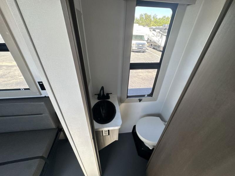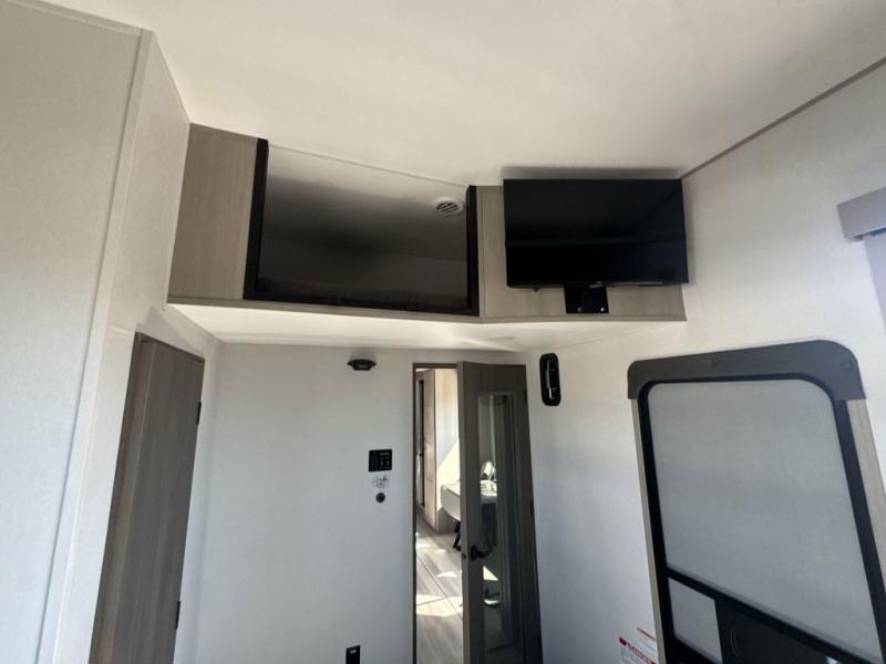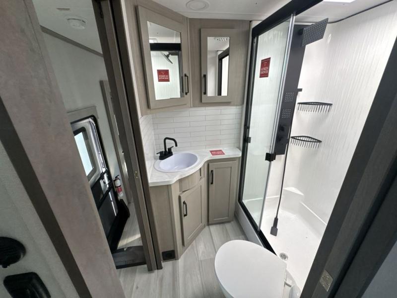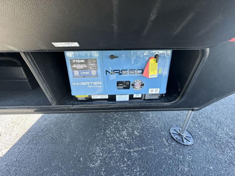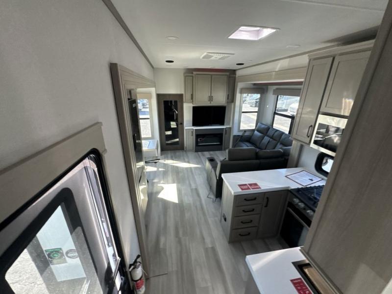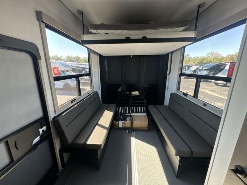 Any time spent in this spacious toy hauler will be time well spent! The 14' garage includes a Liftsuite system, an overhead loft bed and a flip-up pet dish for your furry friends. Once you enter in the main living area, you can relax on the L-shaped sofa with recline across from the fireplace, and there is a free-standing dinette if you want to play a game or two. The chef of your group will love the generous counter space in the kitchen, and the dual entry bath will let everyone stay clean throughout your trip! Head to the front master bedroom to enjoy the queen bed slide out with an optional king bed, a slide top dresser with TV prep, plus a large front closet, complete with washer and dryer prep!
