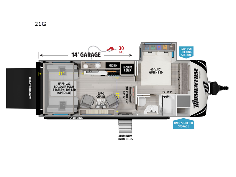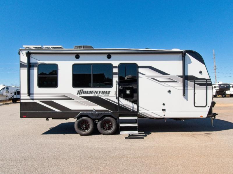 The Momentum 21G toy hauler combines a spacious garage for your gear with a fully equipped interior that delivers comfort and convenience wherever your adventures take you.