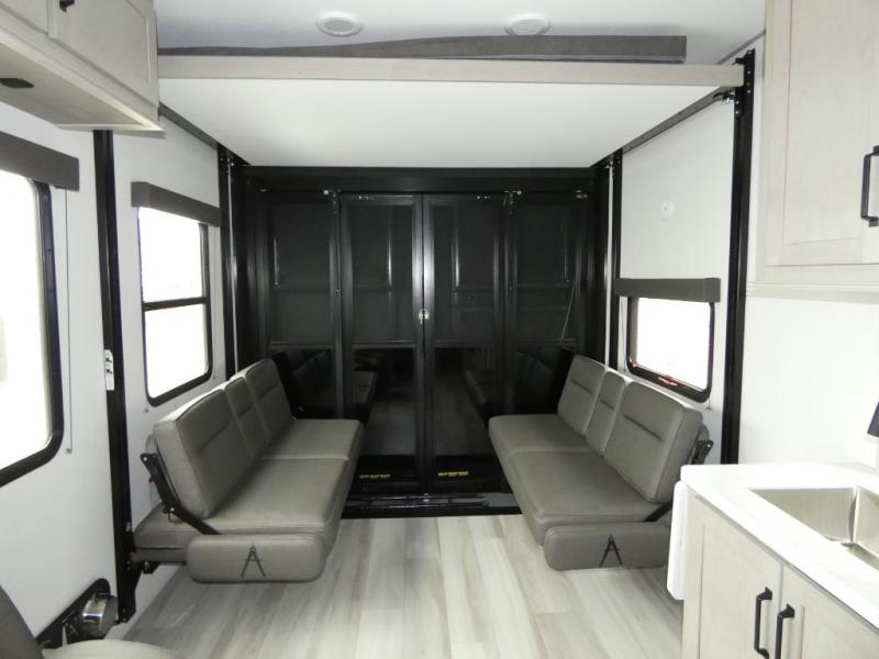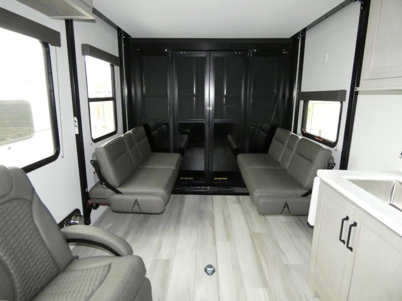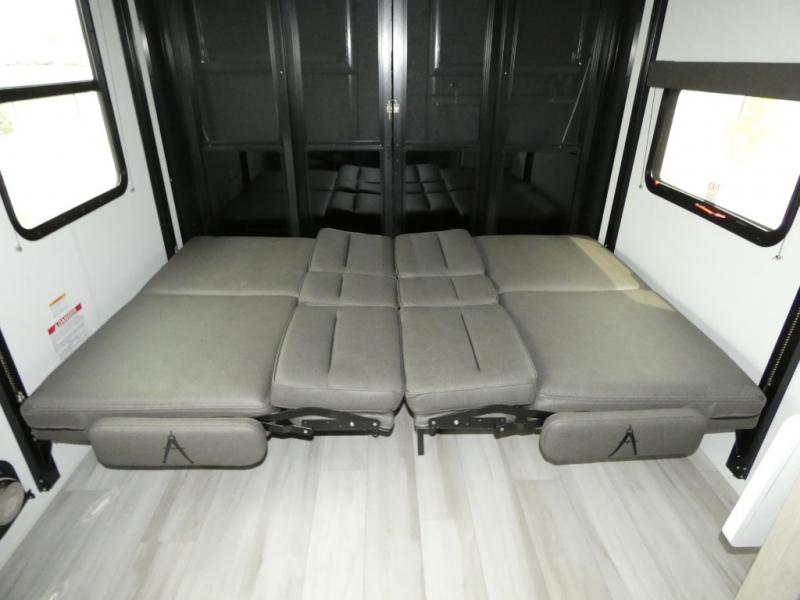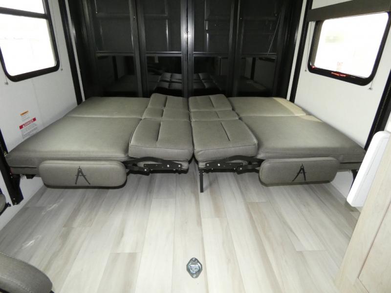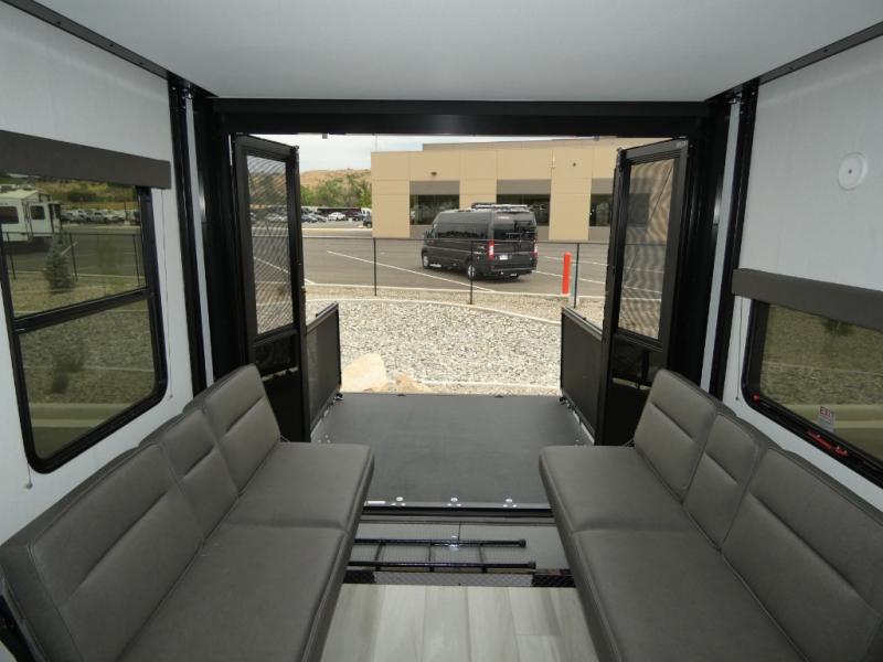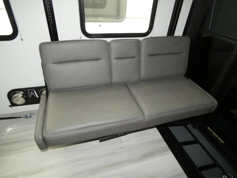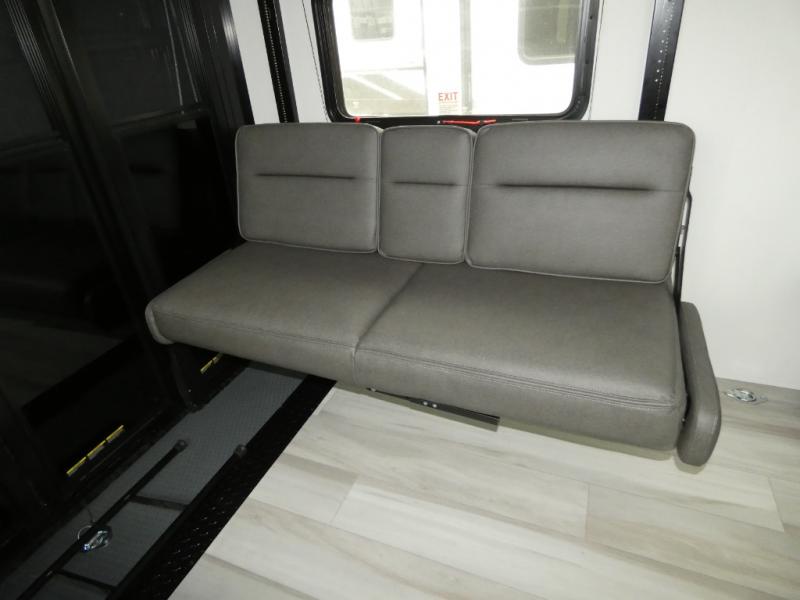 You'll be a force to reckon with in this Momentum G-Class toy hauler! The master suite provides great convenience since it contains extra space from the king bed slide, and the private entrance into the dual-entry bathroom allows you to discreetly clean up each morning. The chef of your group can make breakfast on the three burner range, while others relax on the Euro chairs. There is also a flip-up countertop extension for more counter space, and you can even feed your furry friends since there is a flip-up pet dish. This model also includes Happi-Jac rollover sofas and a table with an optional top bed for your guests!