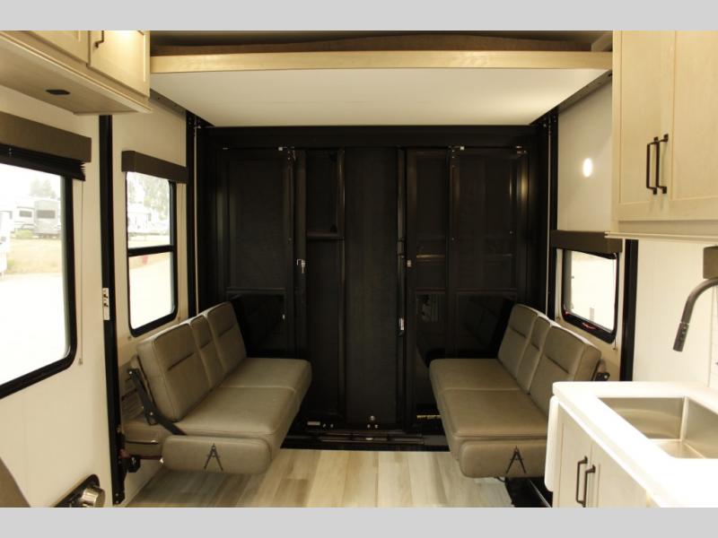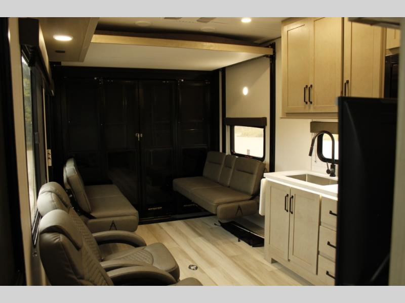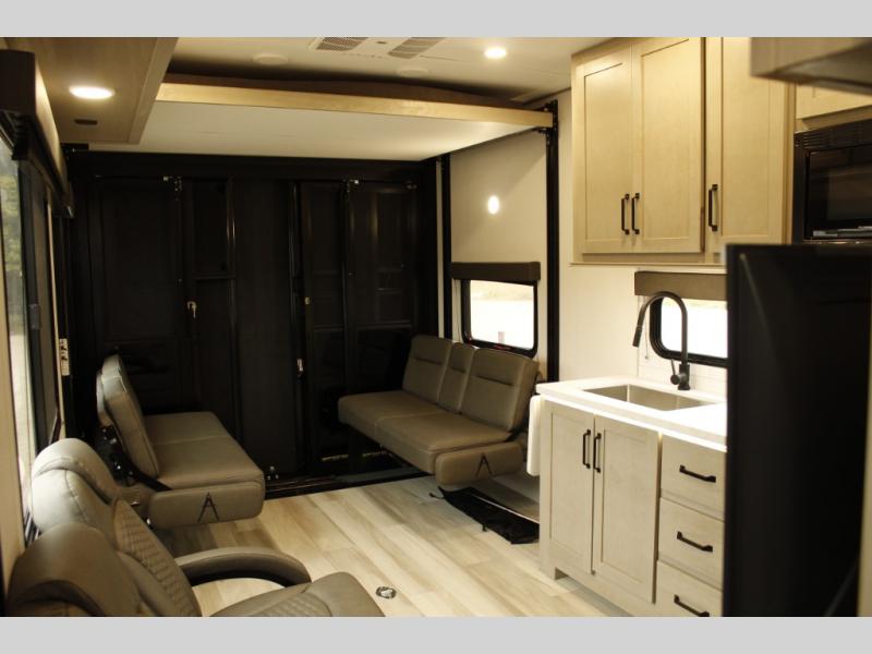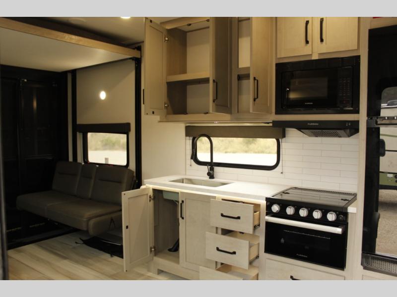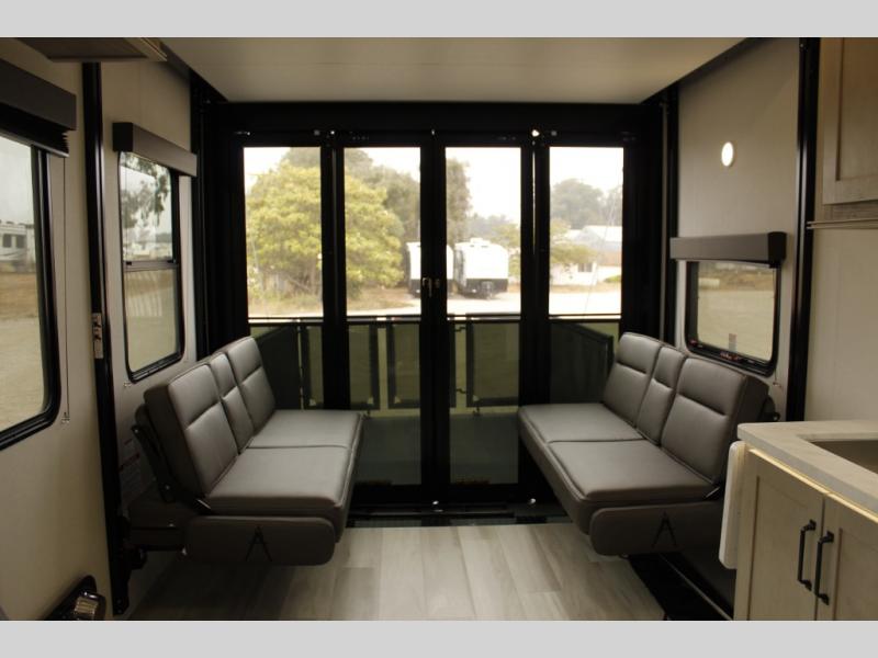 You'll be a force to reckon with in this Momentum G-Class toy hauler! The master suite provides great convenience since it contains extra space from the king bed slide, and the private entrance into the dual-entry bathroom allows you to discreetly clean up each morning. The chef of your group can make breakfast on the three burner range, while others relax on the Euro chairs. There is also a flip-up countertop extension for more counter space, and you can even feed your furry friends since there is a flip-up pet dish. This model also includes Happi-Jac rollover sofas and a table with an optional top bed for your guests!