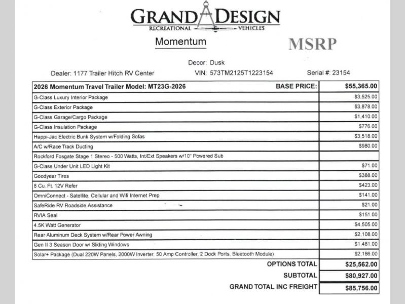 New 2026 Grand Design Momentum G-Class 23G Toy Hauler Travel Trailer