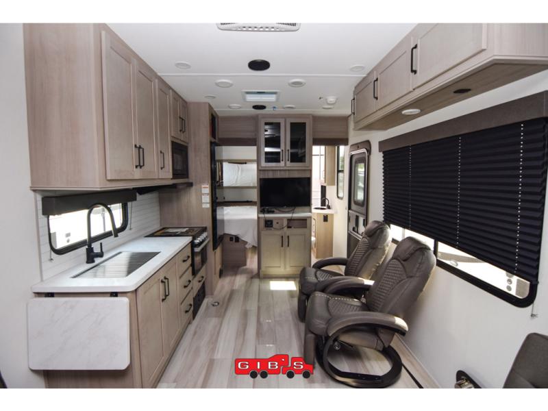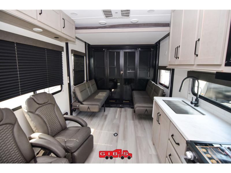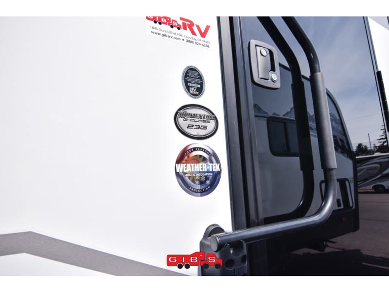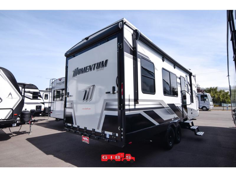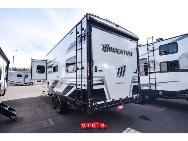 Are you looking for adventure and fun? The Momentum G-Class toy hauler by Grand Design will help you find it! You can explore during any season you choose with the Insulation Package that includes a heated and enclosed underbelly with suspended tanks, a high-capacity furnace, a moisture barrier floor enclosure, and cabinet-mounted heat ducts. Each model includes a fuel station with an interior and exterior gauge, a dovetail rear rend, and 2,500-LB tie-downs anchored into the chassis. Throughout the Momentum G-Class interior, you'll enjoy many comfortable features like large panoramic windows, a shower skylight, USB chargers in the bedroom, and residential cabinetry.
