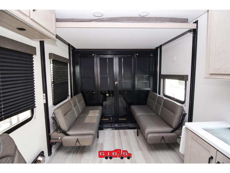 You'll be a force to reckon with in this Momentum G-Class toy hauler! The master suite provides great convenience since it contains extra space from the king bed slide, and the private entrance into the dual-entry bathroom allows you to discreetly clean up each morning. The chef of your group can make breakfast on the three burner range, while others relax on the Euro chairs. There is also a flip-up countertop extension for more counter space, and you can even feed your furry friends since there is a flip-up pet dish. This model also includes Happi-Jac rollover sofas and a table with an optional top bed for your guests!