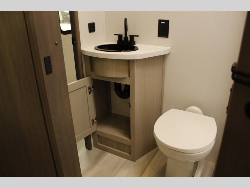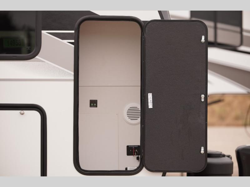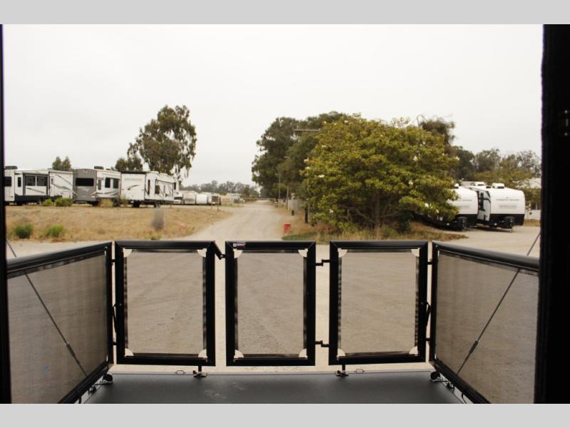 This toy hauler will feel a little more like home since it includes a front private bedroom with a queen bed and dual wardrobes for your things. There is a spacious full bath with radius shower, vanity with medicine cabinet plus toilet, and the full kitchen will allow you to cook meals each day on the three burner cooktop and microwave. There is also a 10 cu. ft. 12V refrigerator to store perishables for the week. You will also enjoy a 200W solar panel outside, along with a patio awning, a 7' ramp door, and many more features.