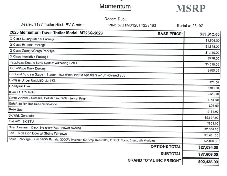 SALE PRICE INCLUDES 2 LITHIUM BATTERIES OR 6 VOLTS, FIFTH WHEEL HITCH + INSTALL, DELUXE AWNING TOPPER. PLUS THE MEGA PLATINUM RV STARTER KIT! A $500 VLUE! PLUS NO HIDDEN FEES!