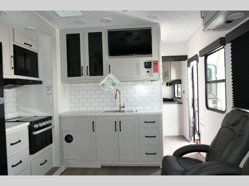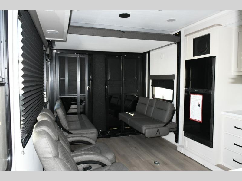 The 13' 6" garage provides secure space for your toys, complete with 2,500 lb. tie-downs anchored into the chassis. Once unloaded, the ramp door transforms into a patio for lounging or entertaining. A fuel station with gauges inside and out keeps your machines ready to ride, and an outside kitchen beneath the 19' power awning makes mealtime simple while maximizing your outdoor lifestyle.