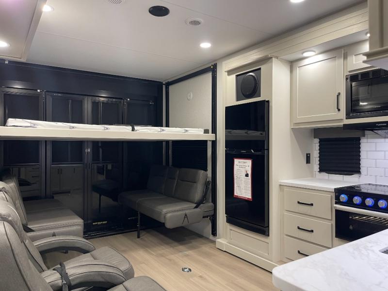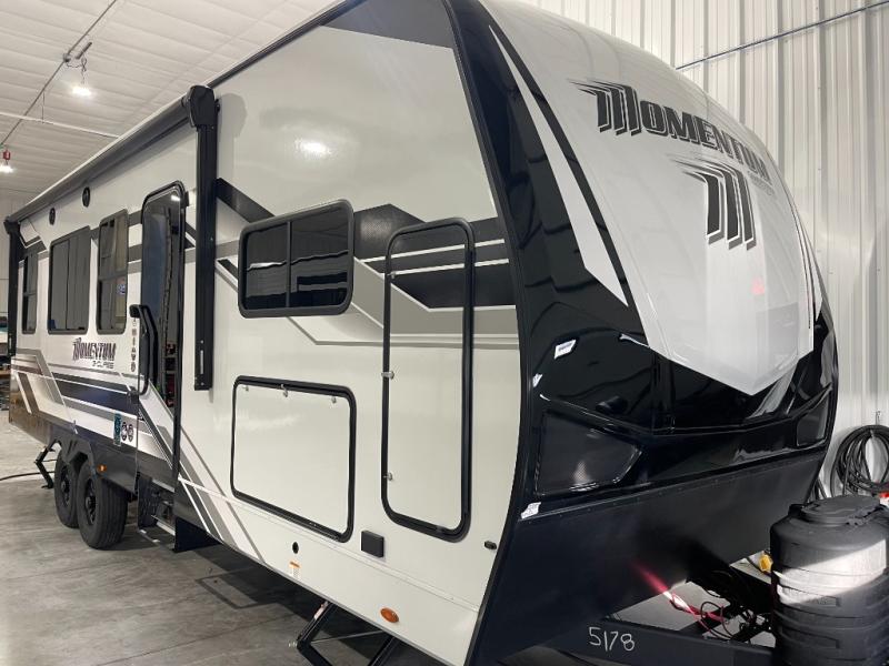 Are you looking for adventure and fun? The Momentum G-Class toy hauler by Grand Design will help you find it! You can explore during any season you choose with the Insulation Package that includes a heated and enclosed underbelly with suspended tanks, a high-capacity furnace, a moisture barrier floor enclosure, and cabinet-mounted heat ducts. Each model includes a high capacity water pump, a dovetail rear end, and 2,500-LB tie-downs anchored into the chassis. Throughout the Momentum G-Class interior, you'll enjoy many comfortable features like large panoramic windows, a shower skylight, USB chargers in the bedroom, and residential cabinetry.