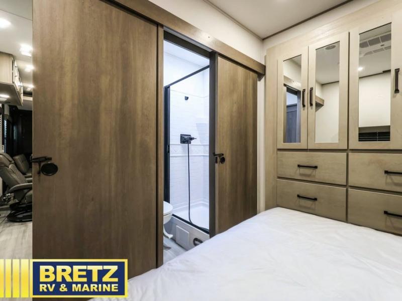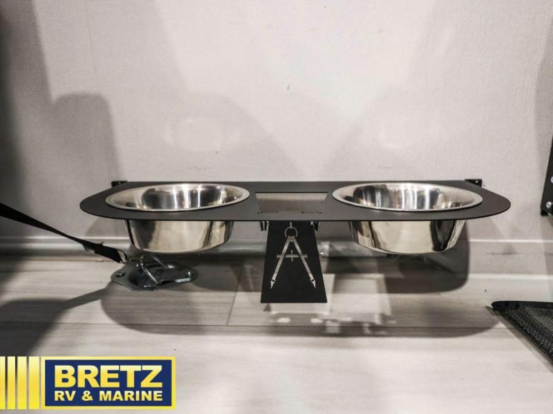 You are sure to love this new Momentum G-Class toy hauler travel trailer that provides enough space up front for great exterior storage and a queen bed in the front bedroom inside that you can easily move around on both sides. A slide out wardrobe offers plenty of space for your clothing with drawers and space to hang clothes, plus there are two nightstands with overhead hanging wardrobes as well. Get cleaned up each day after a fun day of riding and enjoying the outdoors with a walk-in shower along with tons of head room above, and the bath features convenient dual entry and a skylight. The main combined living space offers two Euro chairs and Happi-Jac rollover sofas with a table and optional top bed for seating and sleeping space. This unit will house your favorite toys easily and the rear ramp will allow you to load and unload with little effort. Even your furry friends will be happy with a flip-up pet dish near the back rollover sofas. Outside, a 30 gallon fuel station to keep the fun going for days, and unobstructed storage on both the curbside and roadside for your gear and things.