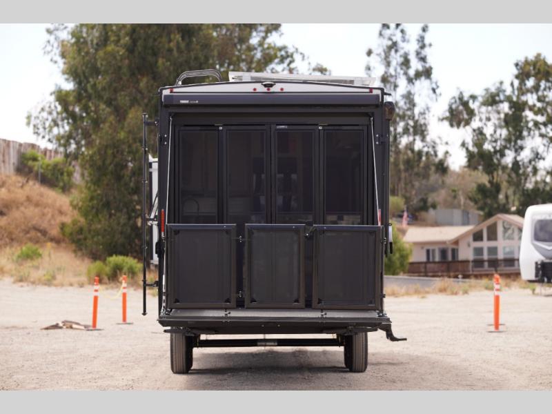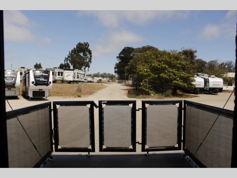 You are sure to love this new Momentum G-Class toy hauler travel trailer that provides enough space up front for great exterior storage and a queen bed in the front bedroom inside that you can easily move around on both sides. A slide out wardrobe offers plenty of space for your clothing with drawers and space to hang clothes, plus there are two nightstands with overhead hanging wardrobes as well. Get cleaned up each day after a fun day of riding and enjoying the outdoors with a walk-in shower along with tons of head room above, and the bath features convenient dual entry and a skylight. The main combined living space offers two Euro chairs and Happi-Jac rollover sofas with a table and optional top bed for seating and sleeping space. This unit will house your favorite toys easily and the rear ramp will allow you to load and unload with little effort. Even your furry friends will be happy with a flip-up pet dish near the back rollover sofas. Outside, a 30 gallon fuel station to keep the fun going for days, and unobstructed storage on both the curbside and roadside for your gear and things.