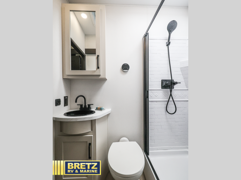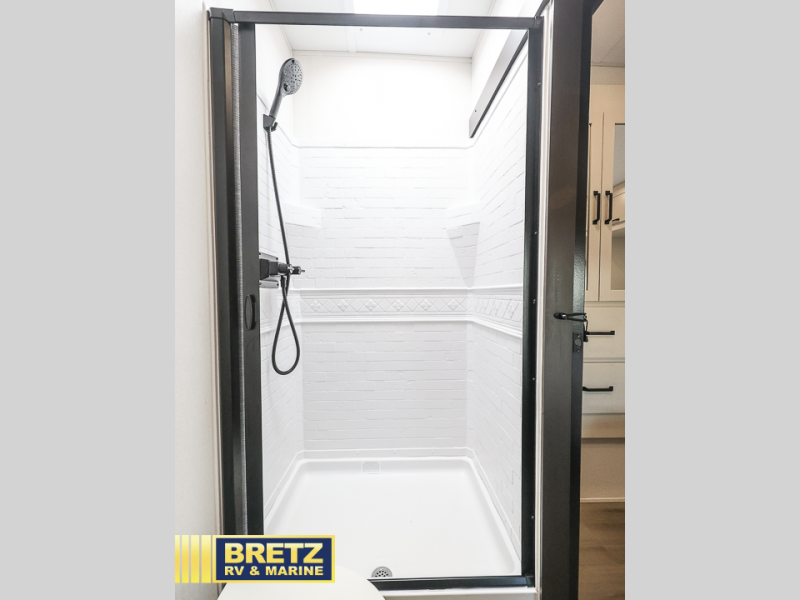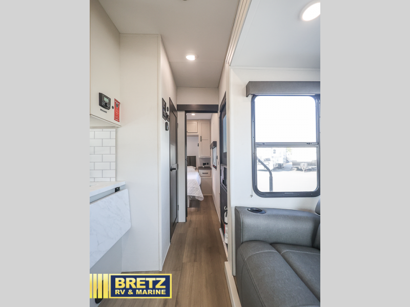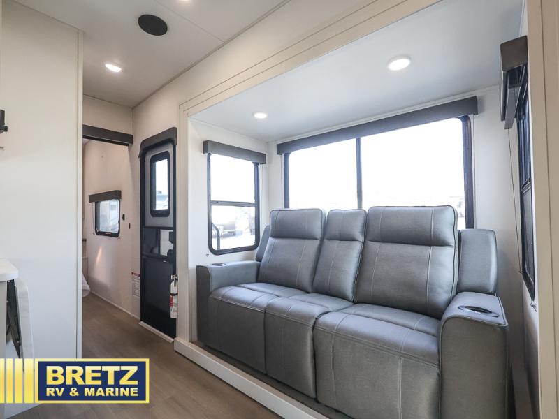 Start your engines for a fun weekend with your toys and your family in this Momentum G-Class toy hauler. The 11' separate garage includes Happi-Jac rollover sofas with a table and an optional top bed, plus a flip-up pet dish for your furry friends! There is even a second entry door which leads directly into the garage so that you don't have to walk through the entire trailer just to get to your cargo. In the front of this unit, you will have your own master suite that has private access to the residential walk-in shower in the dual-entry bathroom. The main living and kitchen area offers everything you need and would want, including theater seating and a TV with storage above the refrigerator!