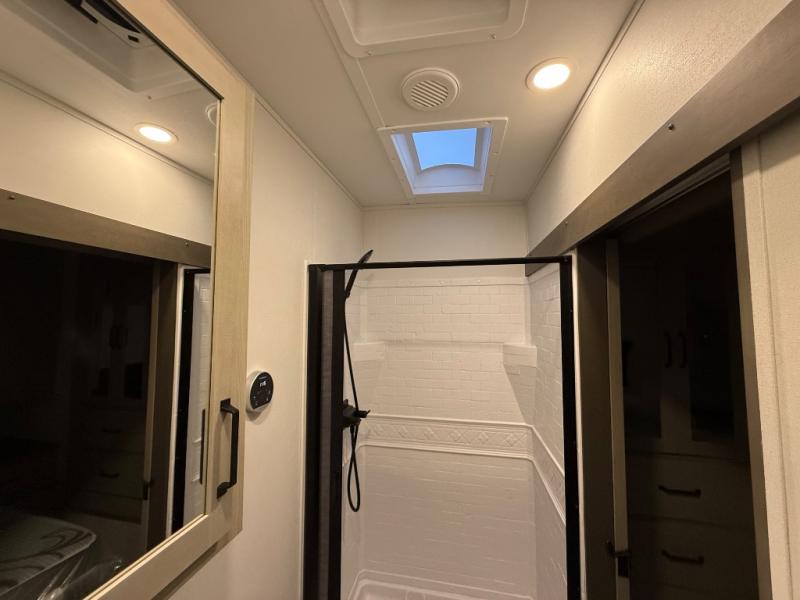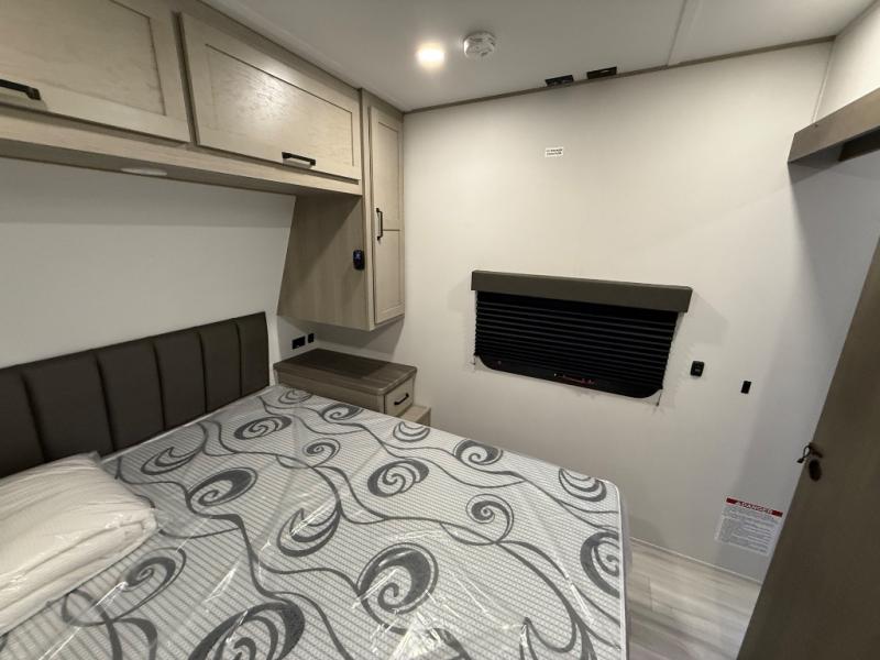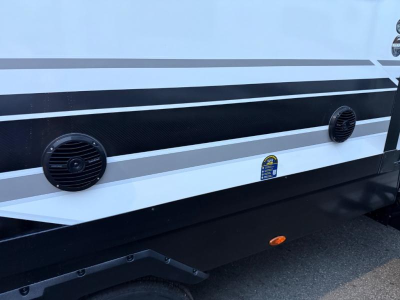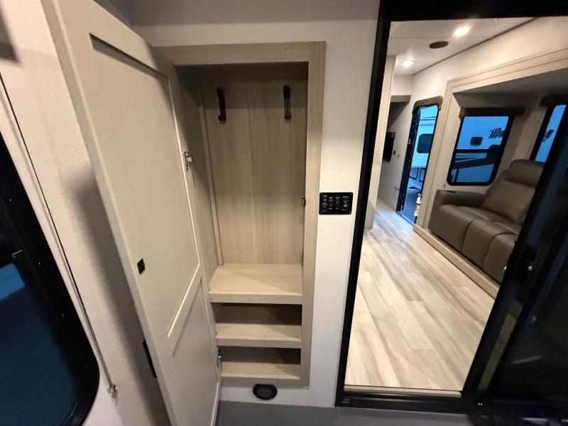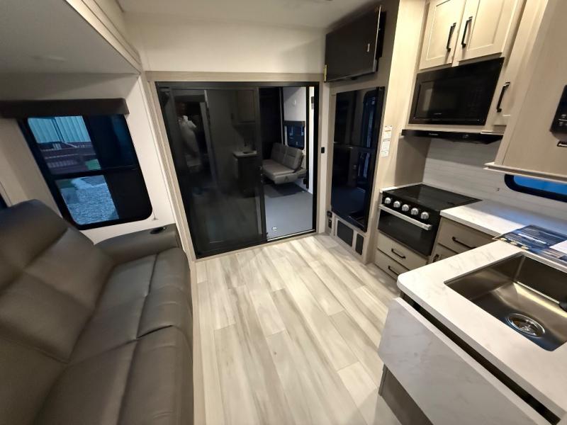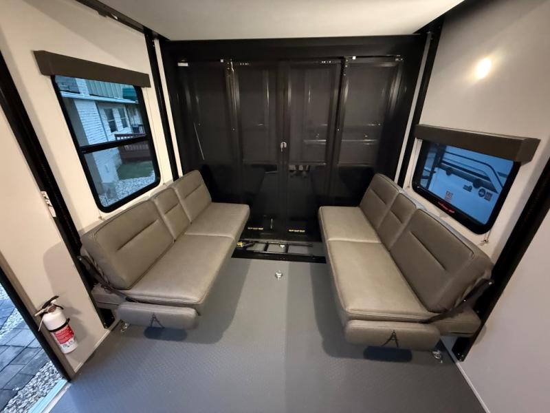Start your engines for a fun weekend with your toys and your family in this Momentum G-Class toy hauler. The 11' separate garage includes Happi-Jac rollover sofas with a table and an optional top bed, plus a flip-up pet dish for your furry friends! There is even a second entry door which leads directly into the garage so that you don't have to walk through the entire trailer just to get to your cargo. In the front of this unit, you will have your own master suite that has private access to the residential walk-in shower in the dual-entry bathroom. The main living and kitchen area offers everything you need and would want, including theater seating and a TV with storage above the refrigerator!