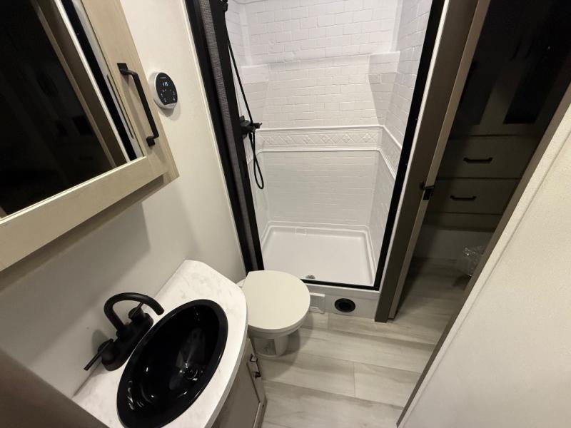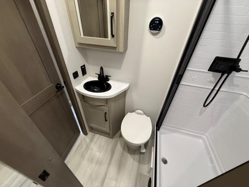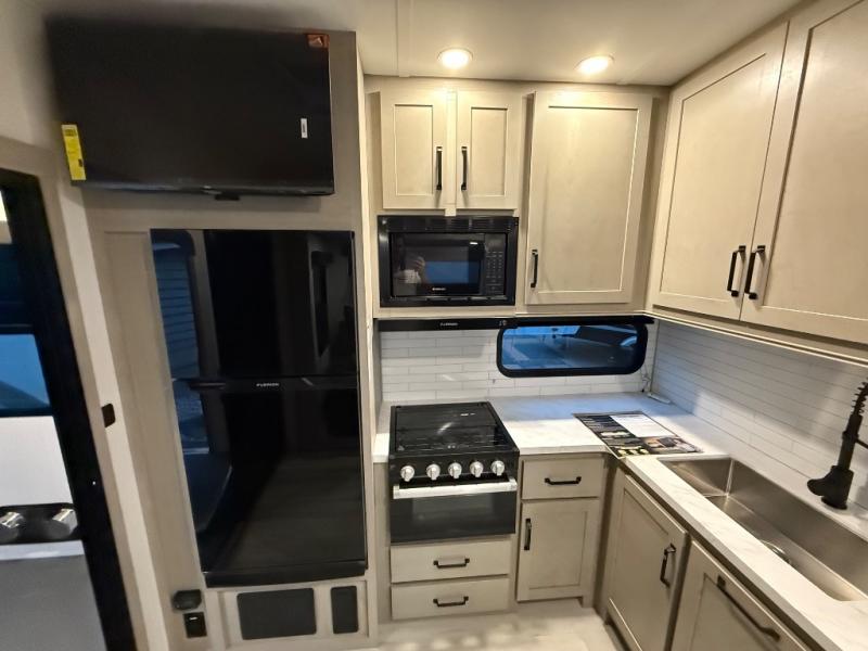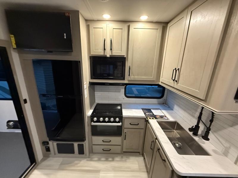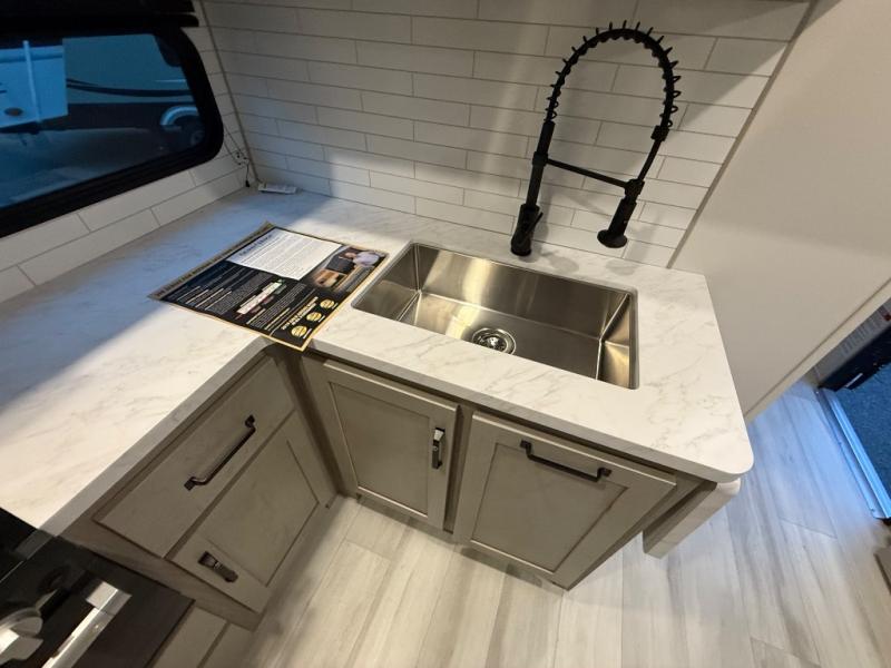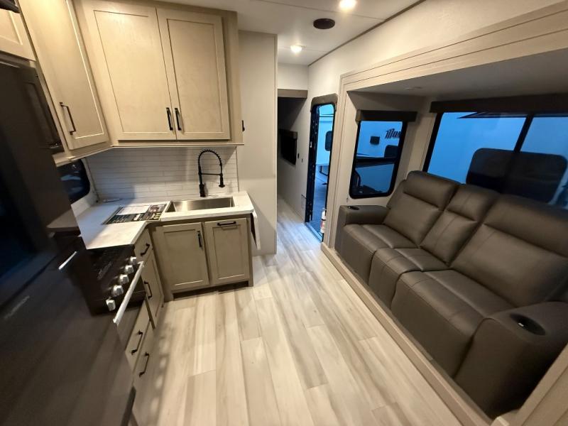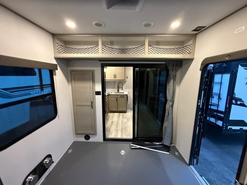Start your engines for a fun weekend with your toys and your family in this Momentum G-Class toy hauler. The 11' separate garage includes Happi-Jac rollover sofas with a table and an optional top bed, plus a flip-up pet dish for your furry friends! There is even a second entry door which leads directly into the garage so that you don't have to walk through the entire trailer just to get to your cargo. In the front of this unit, you will have your own master suite that has private access to the residential walk-in shower in the dual-entry bathroom. The main living and kitchen area offers everything you need and would want, including theater seating and a TV with storage above the refrigerator!