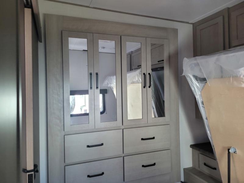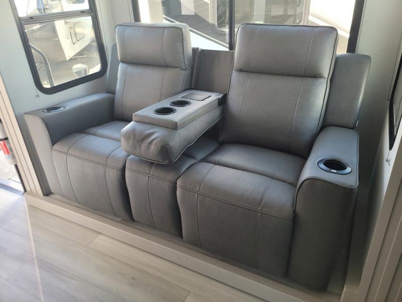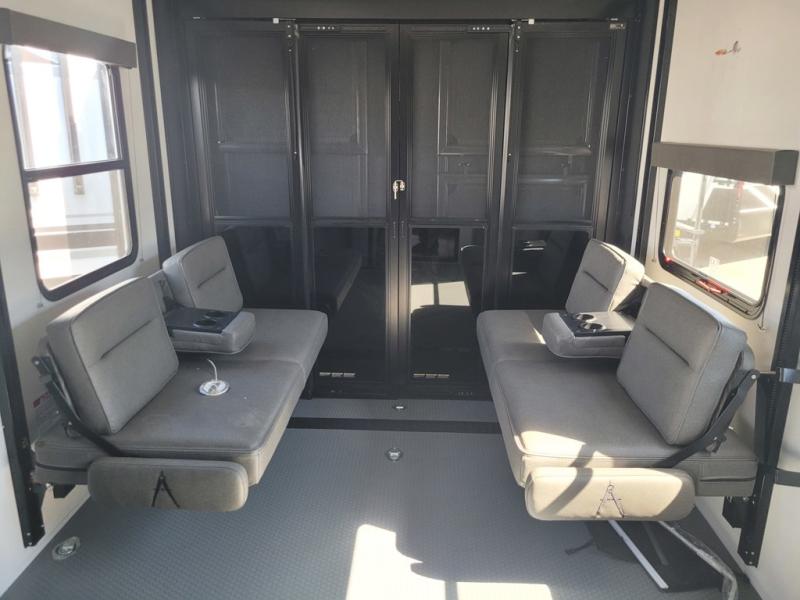 Start your engines for a fun weekend with your toys and your family in this Momentum G-Class toy hauler. The 11' separate garage includes Happi-Jac rollover sofas with a table and an optional top bed, plus a flip-up pet dish for your furry friends! There is even a second entry door which leads directly into the garage so that you don't have to walk through the entire trailer just to get to your cargo. In the front of this unit, you will have your own master suite that has private access to the residential walk-in shower in the dual-entry bathroom. The main living and kitchen area offers everything you need and would want, including theater seating and a TV with storage above the refrigerator!