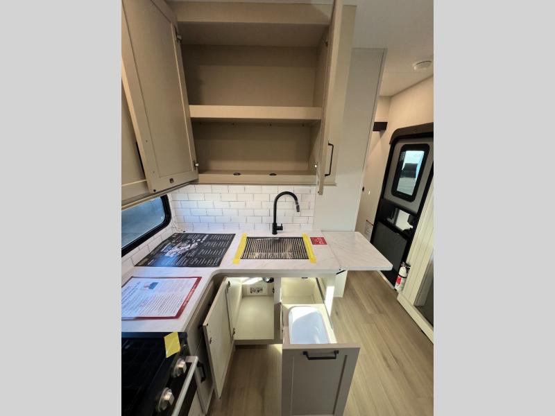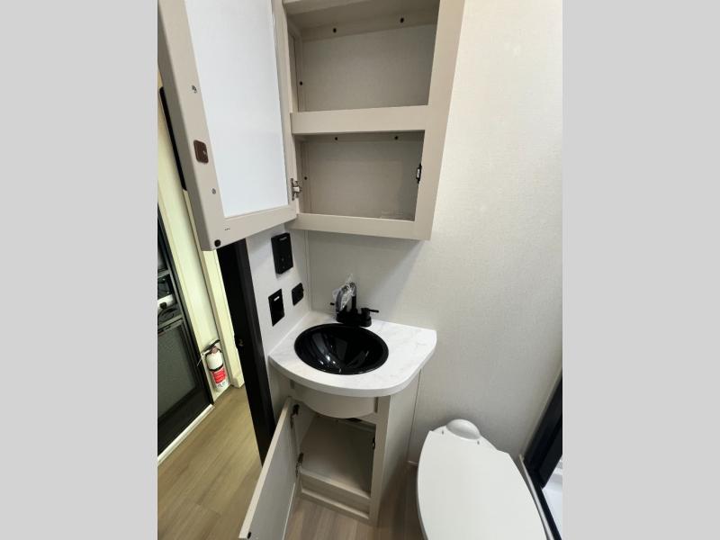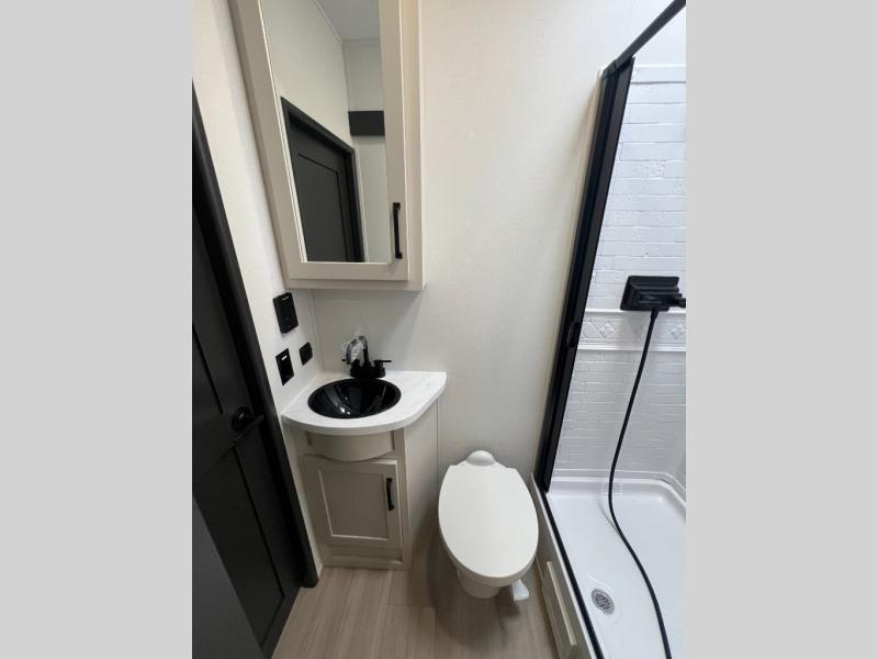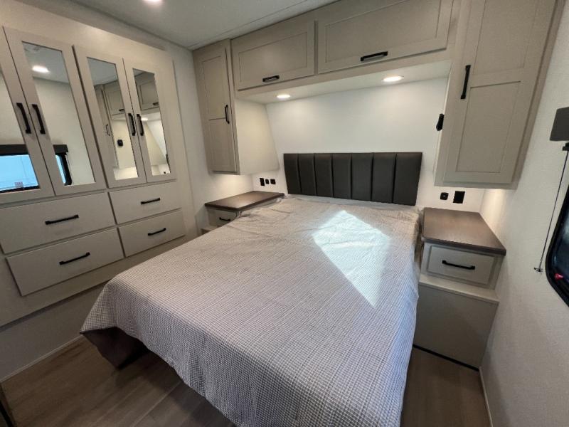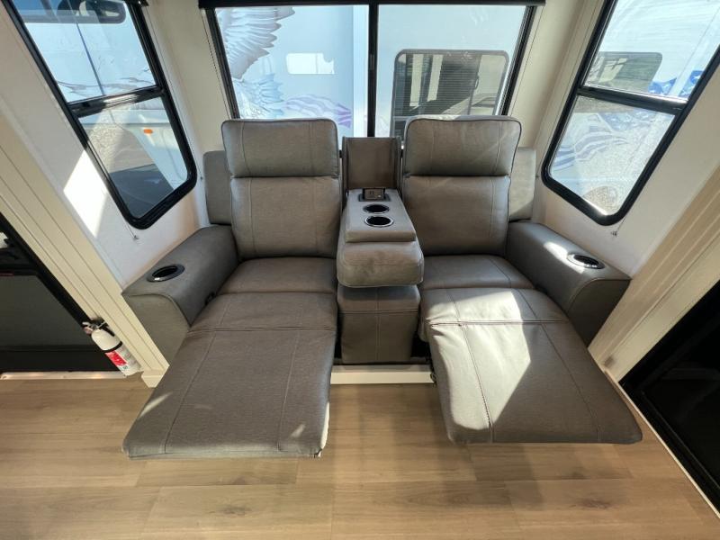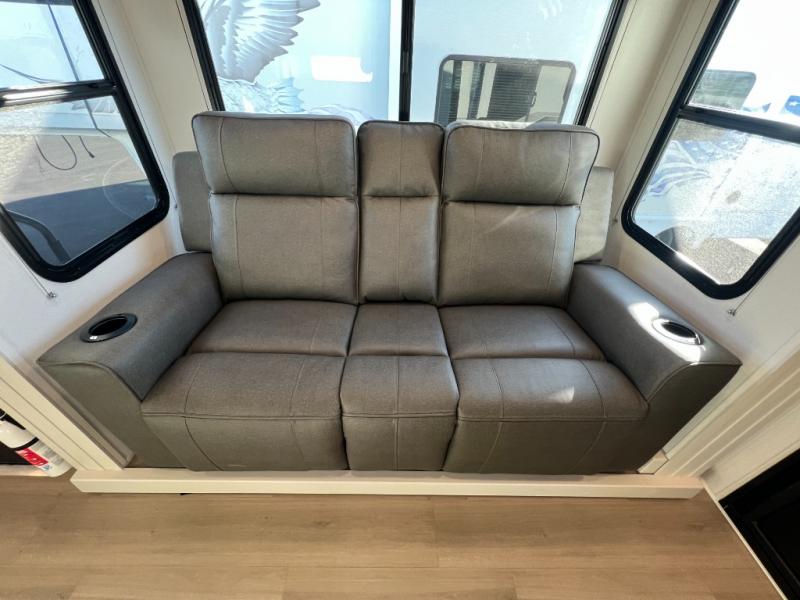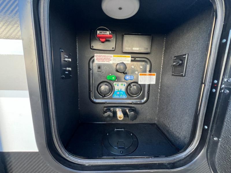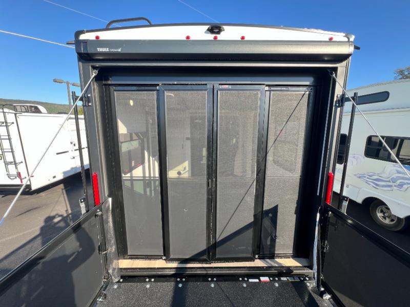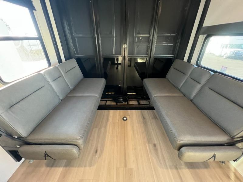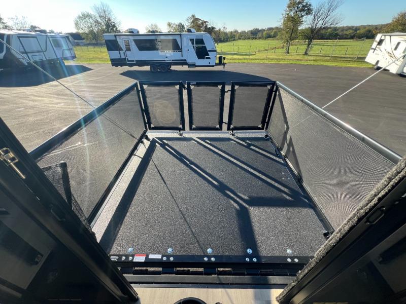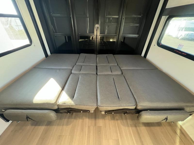 Start your engines for a fun weekend with your toys and your family in this Momentum G-Class toy hauler. The 11' separate garage includes Happi-Jac rollover sofas with a table and an optional top bed, plus a flip-up pet dish for your furry friends! There is even a second entry door which leads directly into the garage so that you don't have to walk through the entire trailer just to get to your cargo. In the front of this unit, you will have your own master suite that has private access to the residential walk-in shower in the dual-entry bathroom. The main living and kitchen area offers everything you need and would want, including theater seating and a TV with storage above the refrigerator!