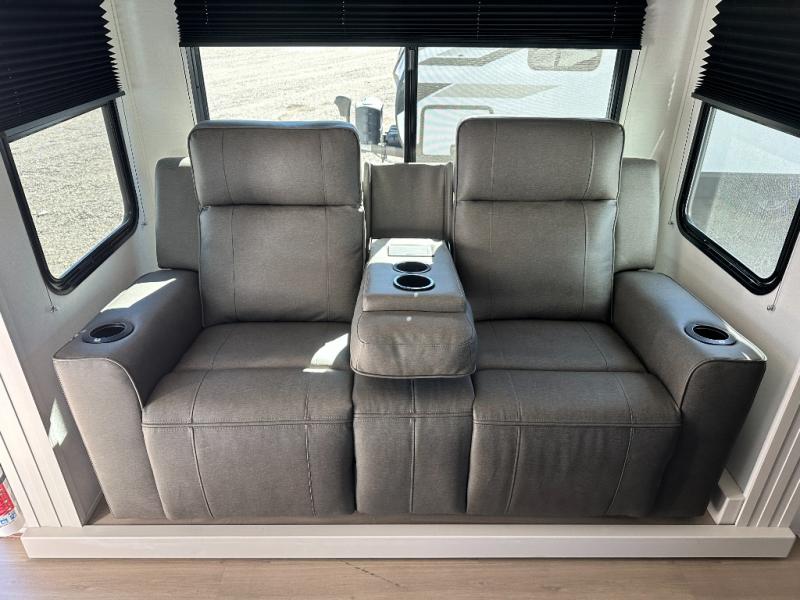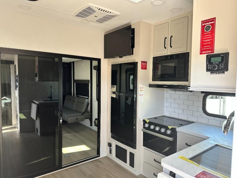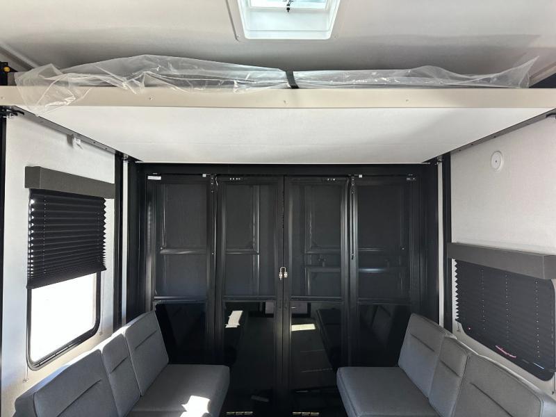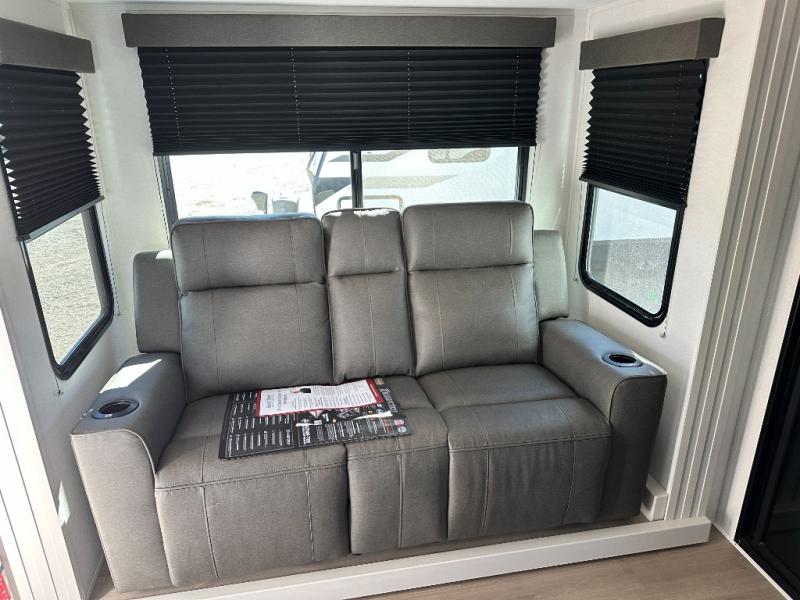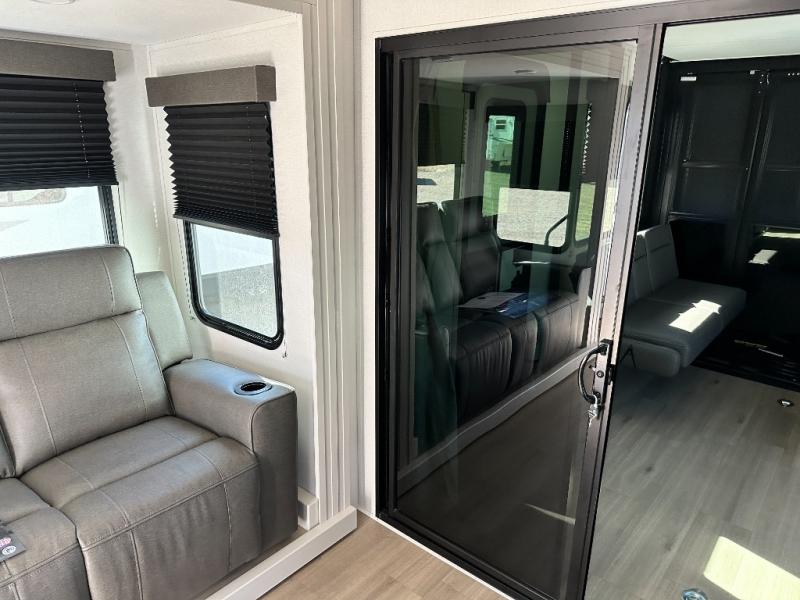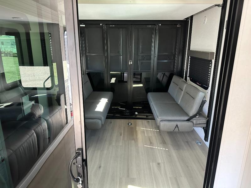 Start your engines for a fun weekend with your toys and your family in this Momentum G-Class toy hauler. The 11' separate garage includes Happi-Jac rollover sofas with a table and an optional top bed, plus a flip-up pet dish for your furry friends! There is even a second entry door which leads directly into the garage so that you don't have to walk through the entire trailer just to get to your cargo. In the front of this unit, you will have your own master suite that has private access to the residential walk-in shower in the dual-entry bathroom. The main living and kitchen area offers everything you need and would want, including theater seating and a TV with storage above the refrigerator!