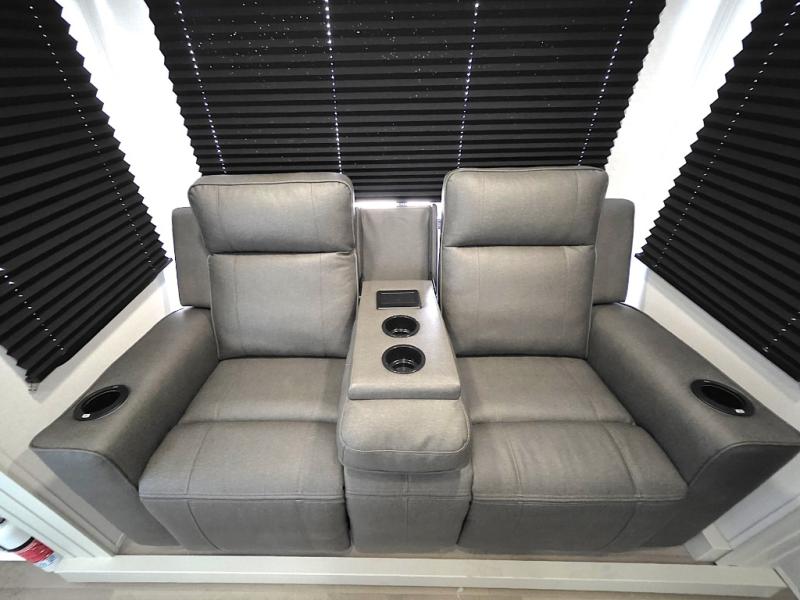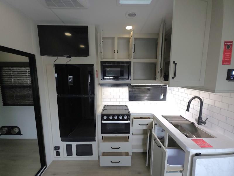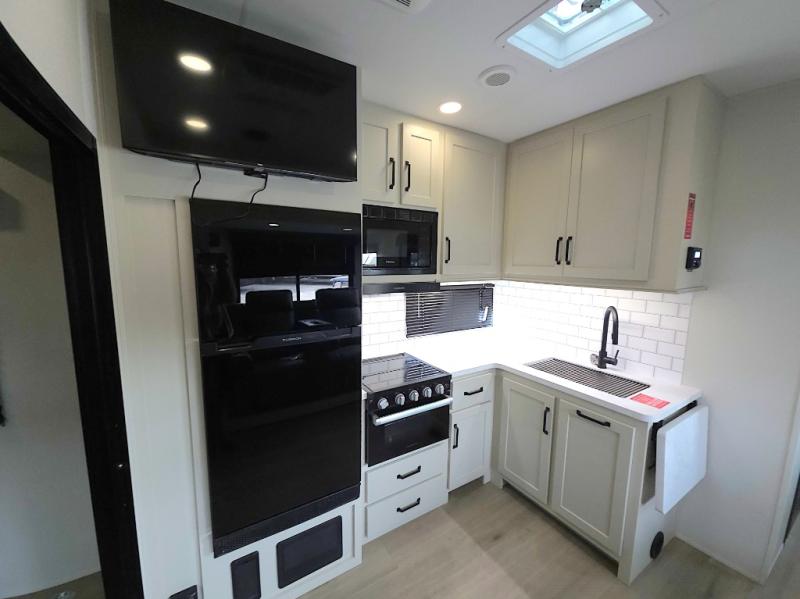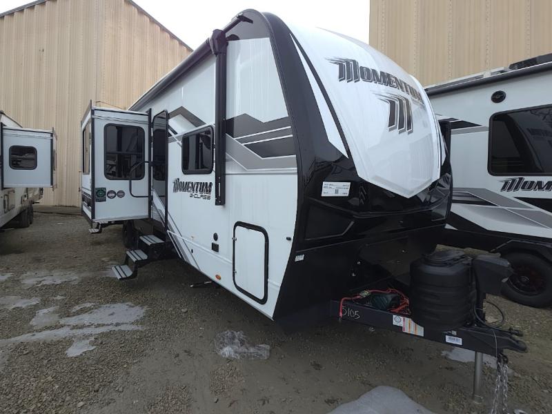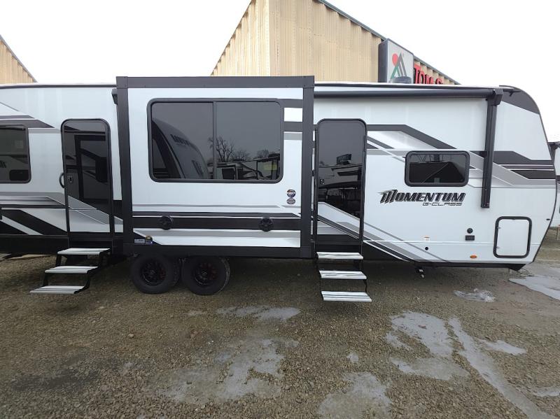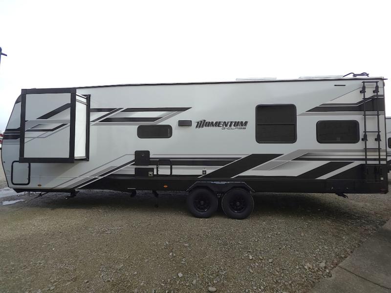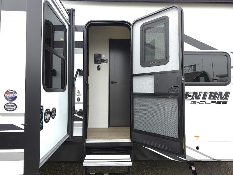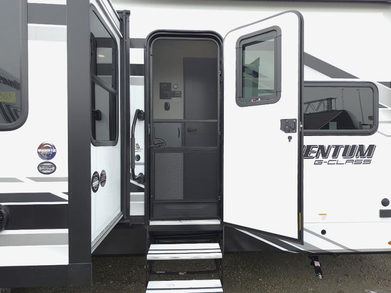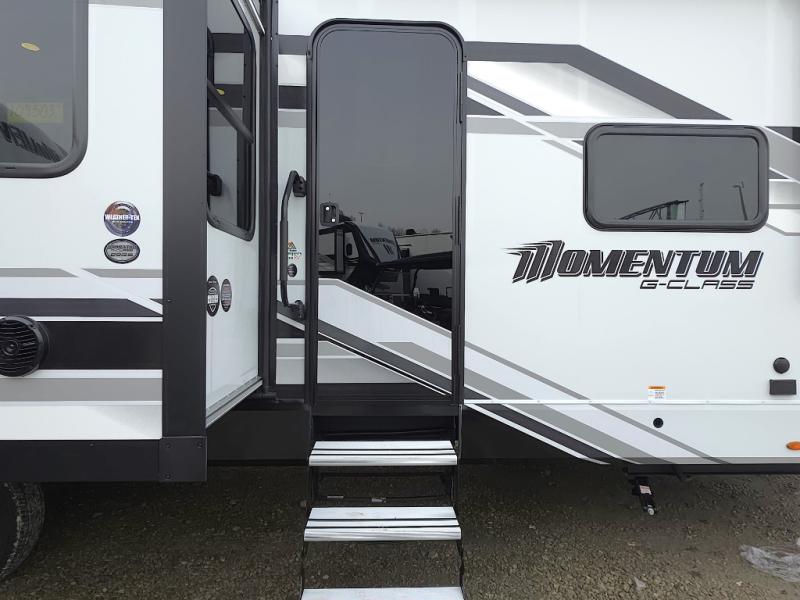 Inside, you’ll be surrounded by upscale residential finishes, including large panoramic windows, residential cabinetry, and a shower skylight that brightens your bathroom space. USB chargers in the bedroom, smart storage solutions, and a full kitchen with modern appliances make life on the road feel just like home. Whether you’re camping in the woods or tailgating at the track, the Momentum G-Class 29GS gives you the freedom to do it all.