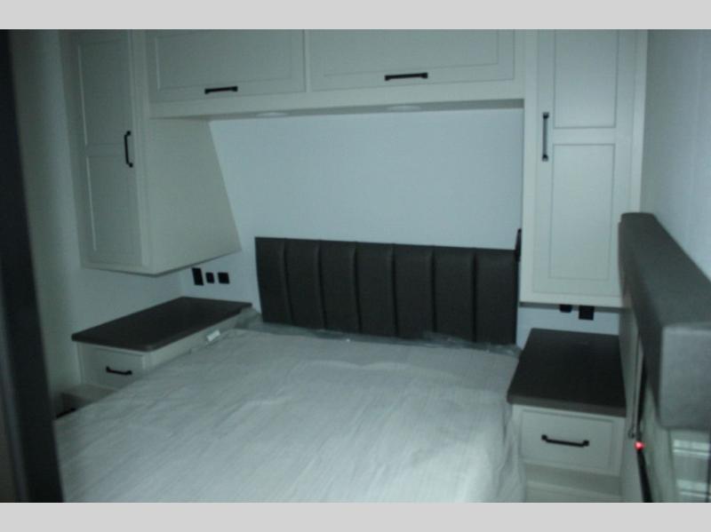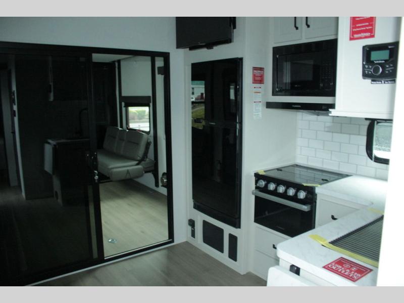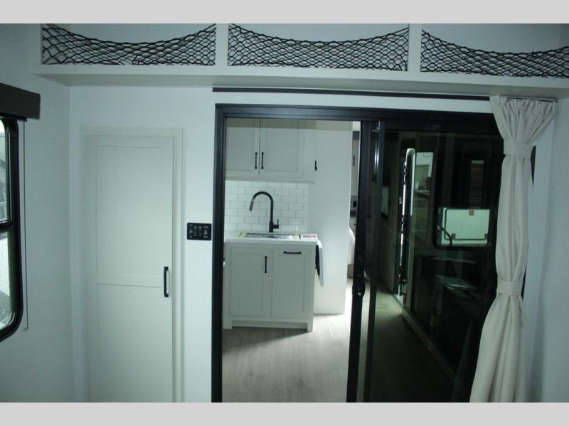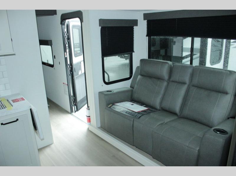 Start your engines for a fun weekend with your toys and your family in this Momentum G-Class toy hauler. The 11' separate garage includes Happi-Jac rollover sofas with a table and an optional top bed, plus a flip-up pet dish for your furry friends! There is even a second entry door which leads directly into the garage so that you don't have to walk through the entire trailer just to get to your cargo. In the front of this unit, you will have your own master suite that has private access to the residential walk-in shower in the dual-entry bathroom. The main living and kitchen area offers everything you need and would want, including theater seating and a TV with storage above the refrigerator!