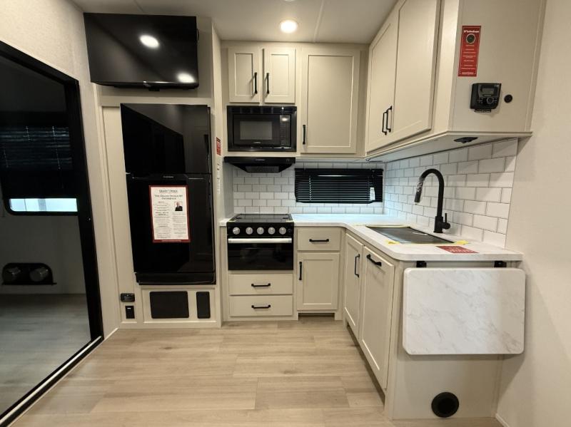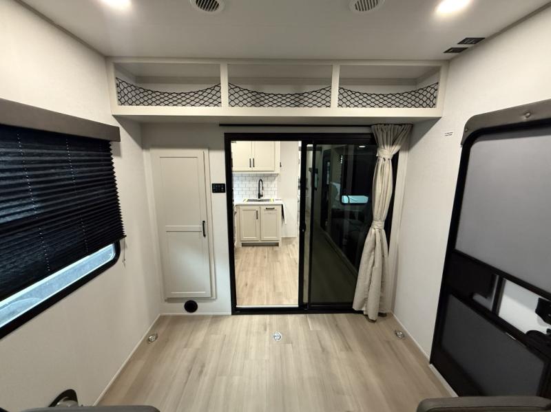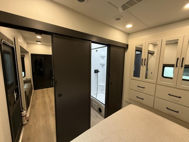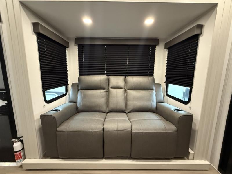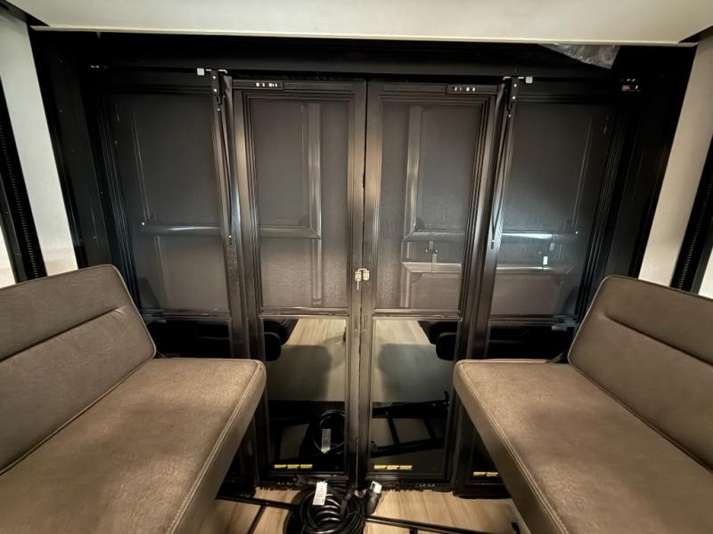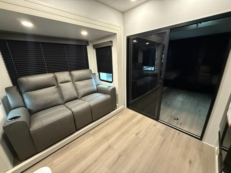 Start your engines for a fun weekend with your toys and your family in this Momentum G-Class toy hauler. The 11' separate garage includes Happi-Jac rollover sofas with a table and an optional top bed, plus a flip-up pet dish for your furry friends! There is even a second entry door which leads directly into the garage so that you don't have to walk through the entire trailer just to get to your cargo. In the front of this unit, you will have your own master suite that has private access to the residential walk-in shower in the dual-entry bathroom. The main living and kitchen area offers everything you need and would want, including theater seating and a TV with storage above the refrigerator!