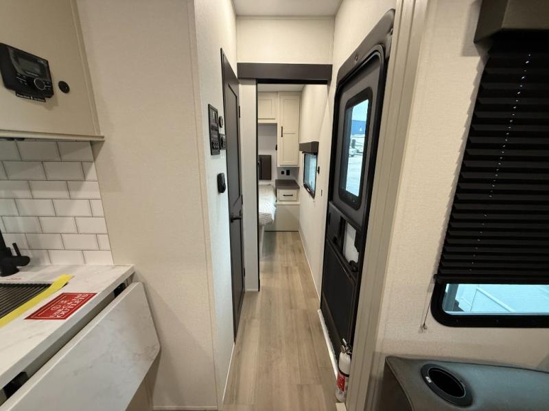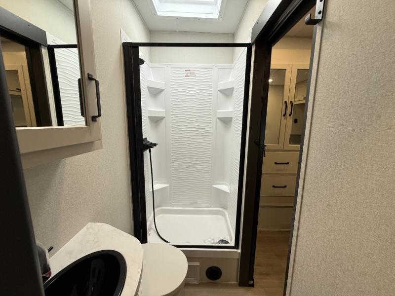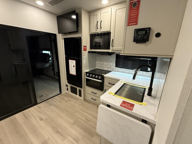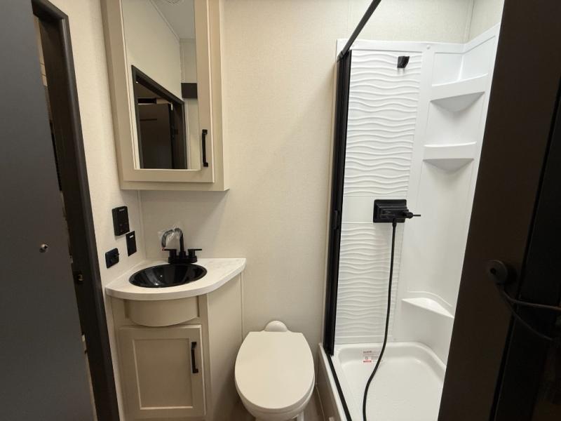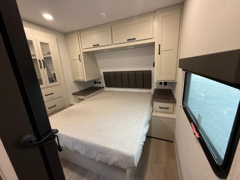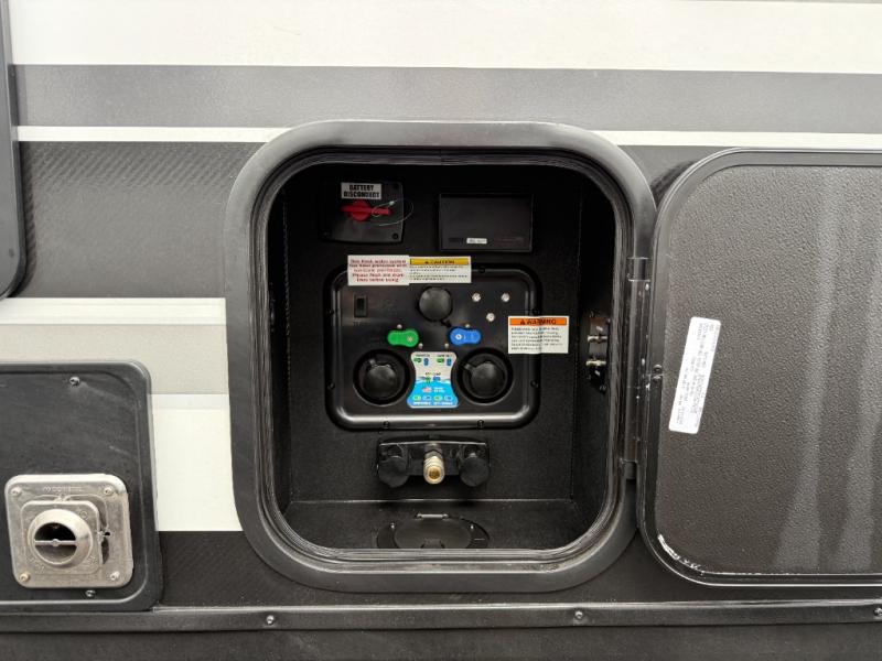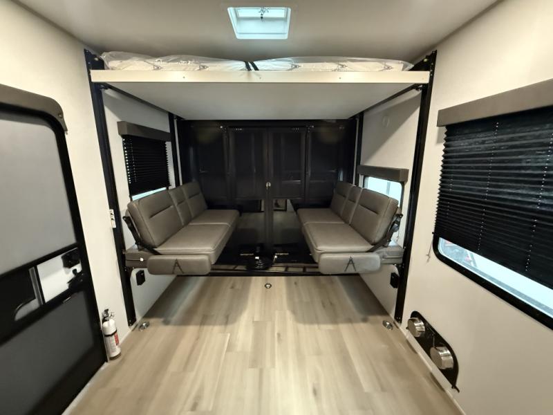 Start your engines for a fun weekend with your toys and your family in this Momentum G-Class toy hauler. The 11' separate garage includes Happi-Jac rollover sofas with a table and an optional top bed, plus a flip-up pet dish for your furry friends! There is even a second entry door which leads directly into the garage so that you don't have to walk through the entire trailer just to get to your cargo. In the front of this unit, you will have your own master suite that has private access to the residential walk-in shower in the dual-entry bathroom. The main living and kitchen area offers everything you need and would want, including theater seating and a TV with storage above the refrigerator!