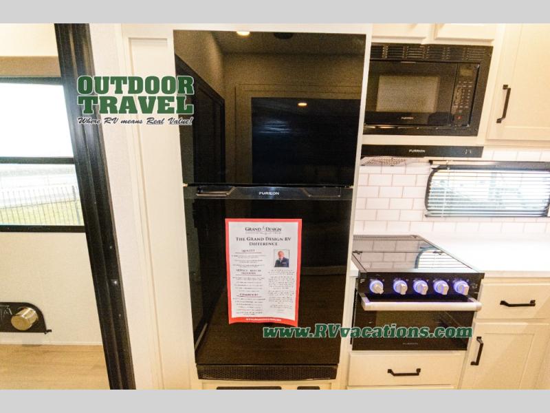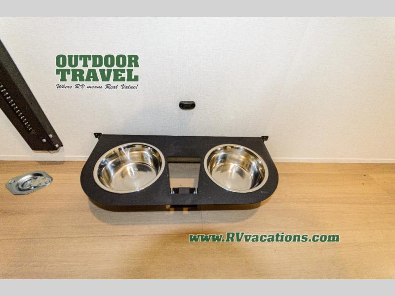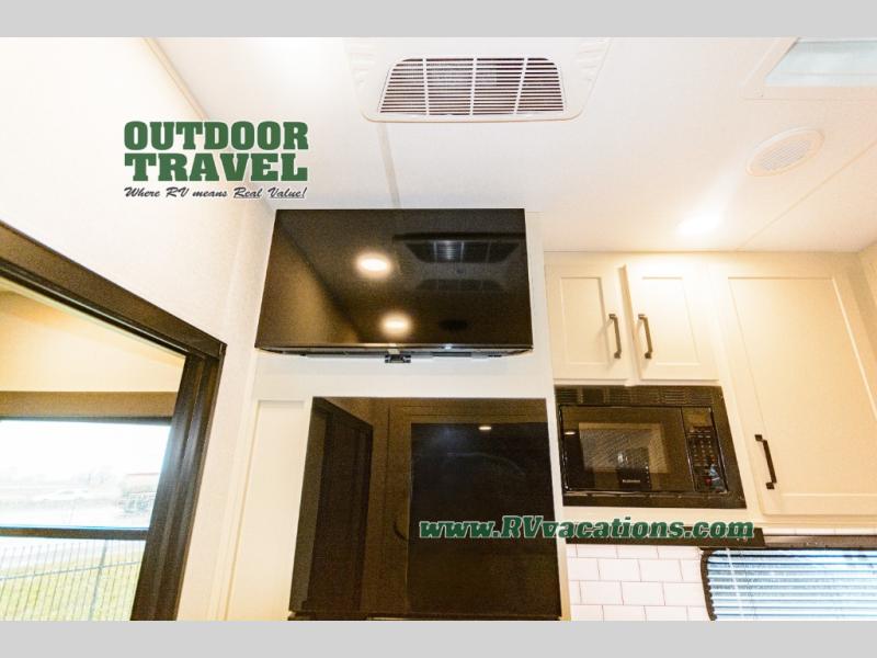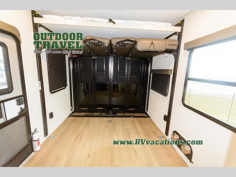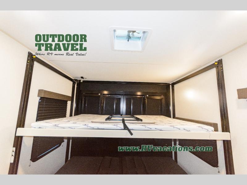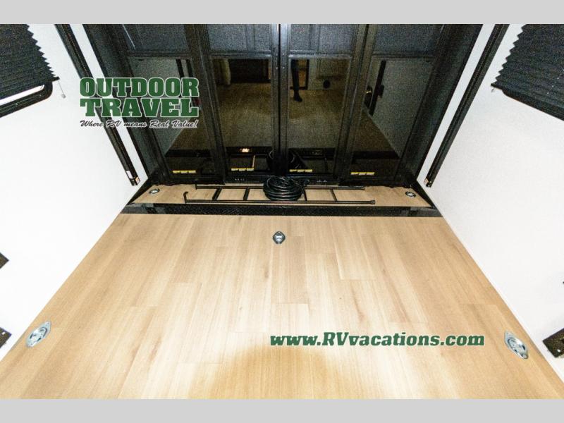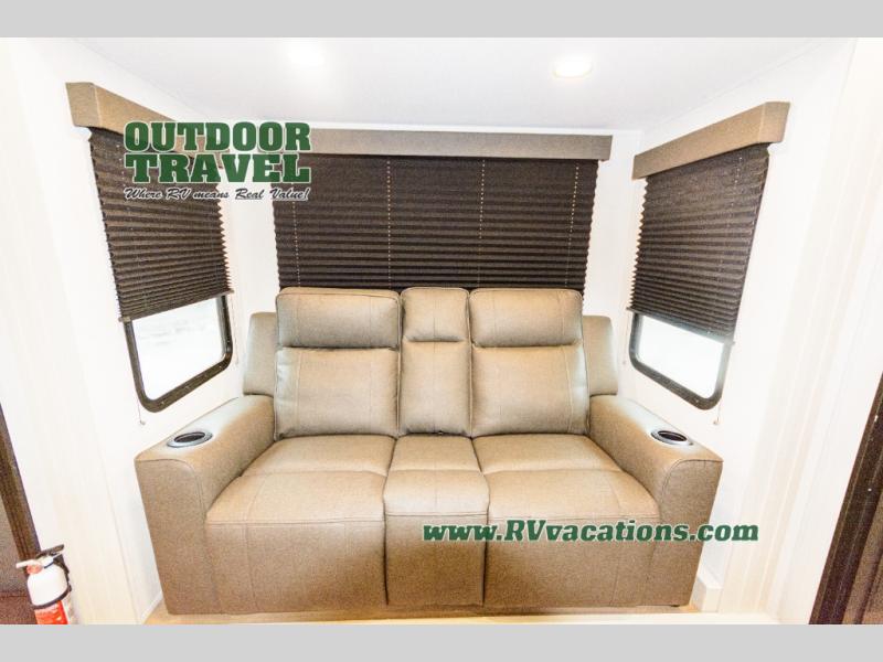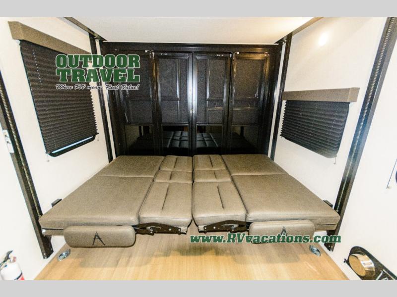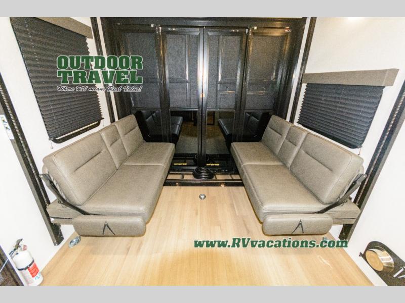 Start your engines for a fun weekend with your toys and your family in this Momentum G-Class toy hauler. The 11' separate garage includes Happi-Jac rollover sofas with a table and an optional top bed, plus a flip-up pet dish for your furry friends! There is even a second entry door which leads directly into the garage so that you don't have to walk through the entire trailer just to get to your cargo. In the front of this unit, you will have your own master suite that has private access to the residential walk-in shower in the dual-entry bathroom. The main living and kitchen area offers everything you need and would want, including theater seating and a TV with storage above the refrigerator!