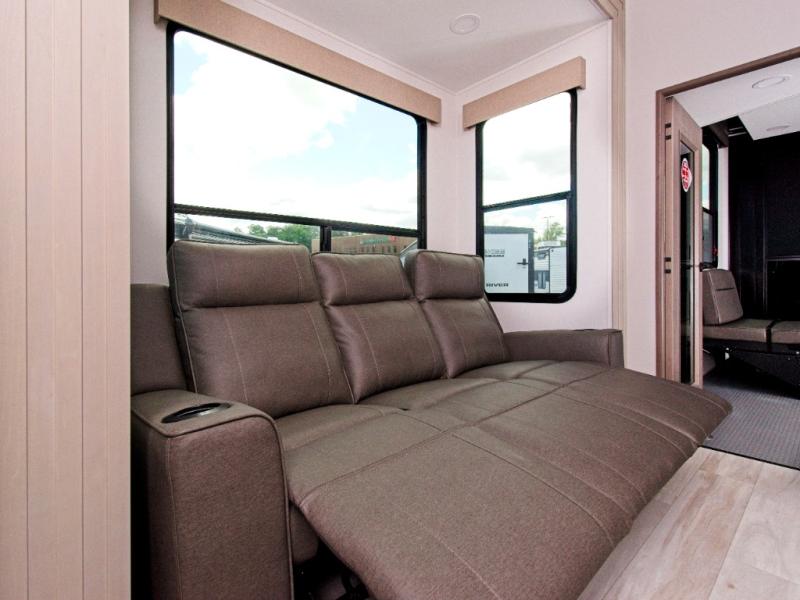 This toy hauler features a convertible rear ramp patio, dual entry doors, and a loft bed for added versatility. Whether you're hosting friends or enjoying a quiet evening, the exterior speakers and theater seating create the perfect atmosphere. The full kitchen and fireplace make it feel like home, while the private bedroom offers a peaceful escape.