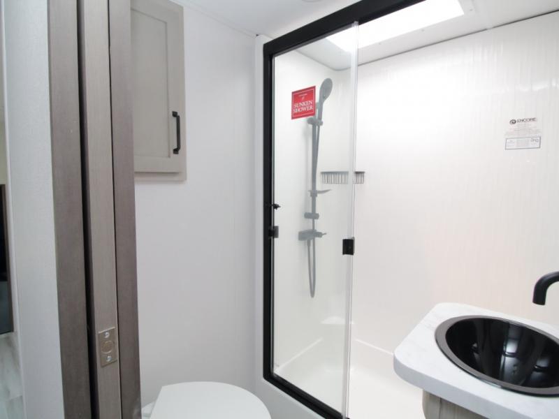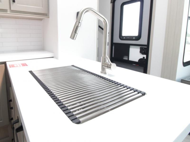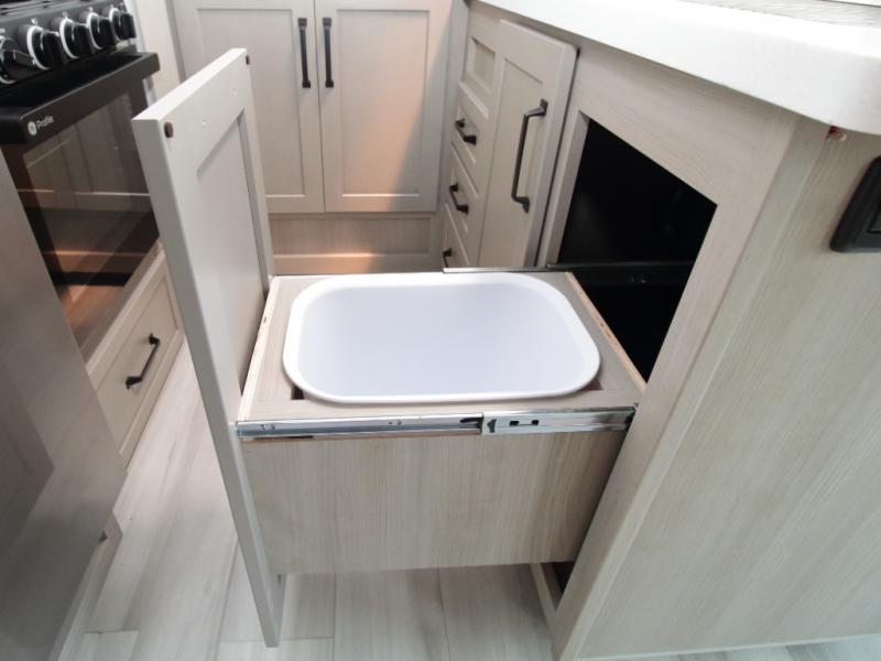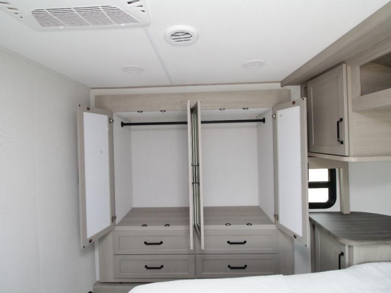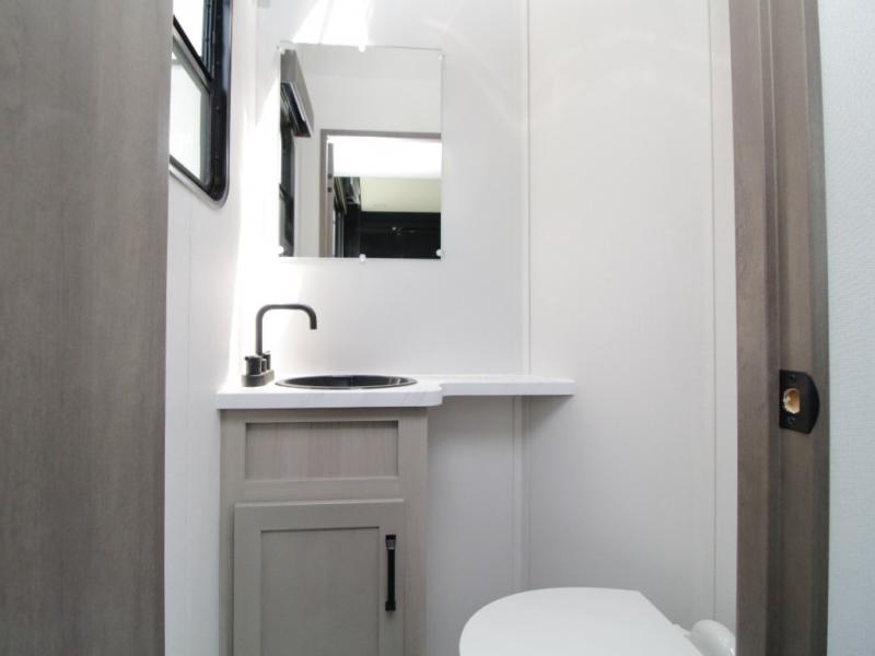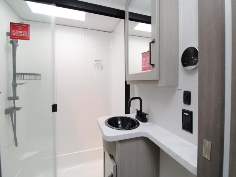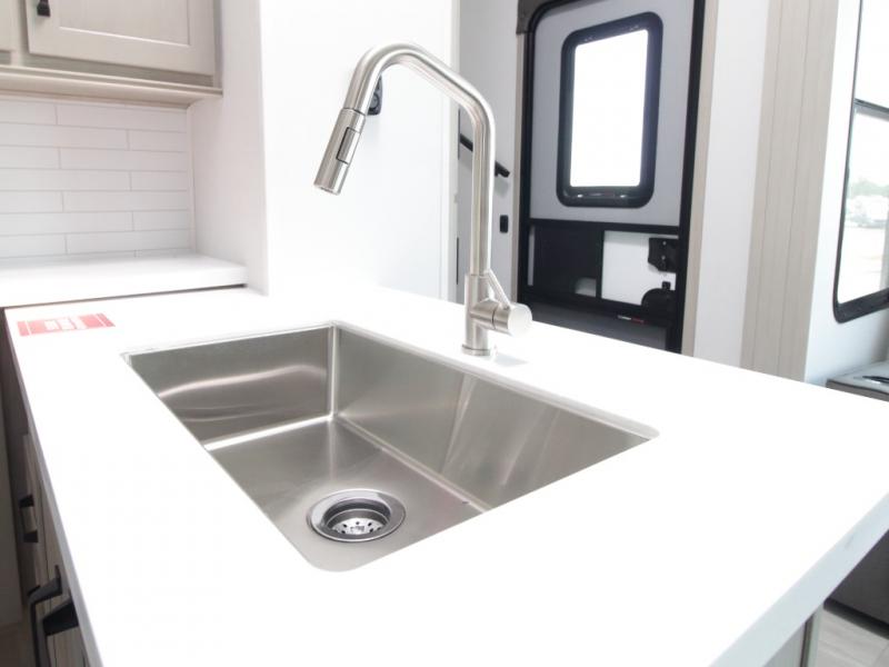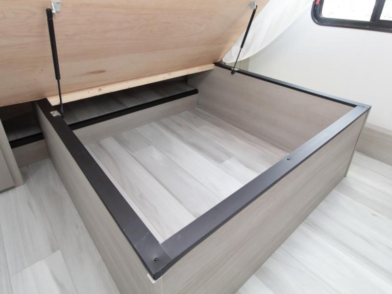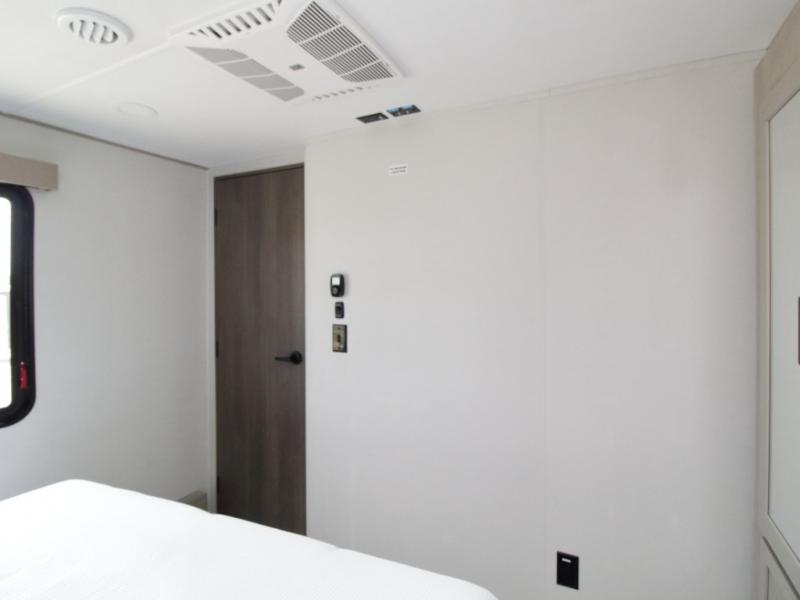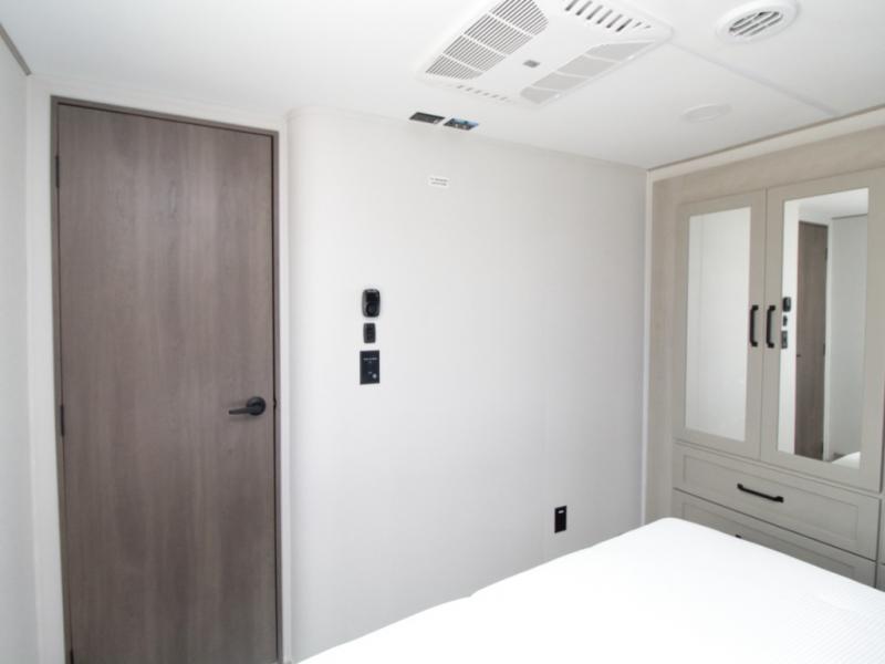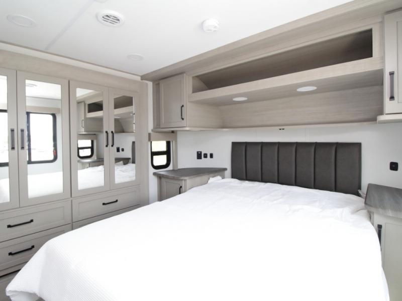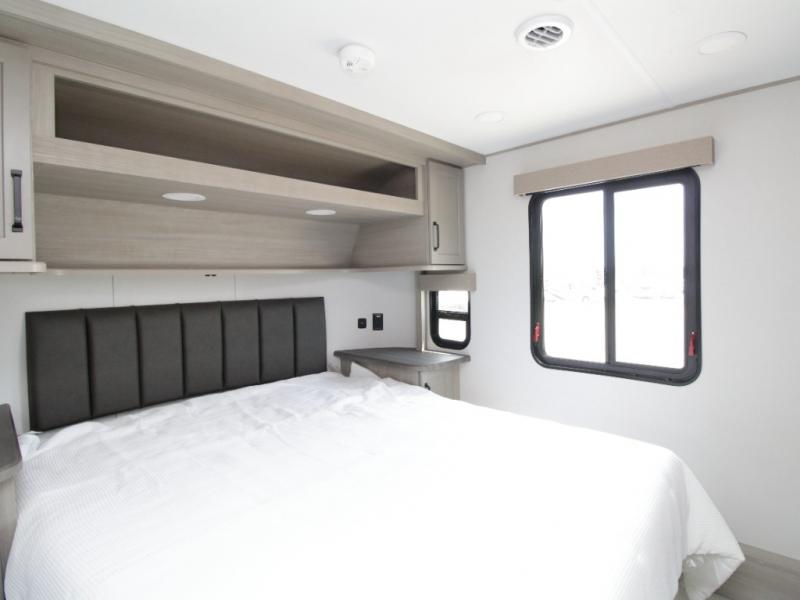 When it's time to unwind, head to the private front bedroom, complete with a walk-around bed, overhead storage, and access to the full bathroom.
