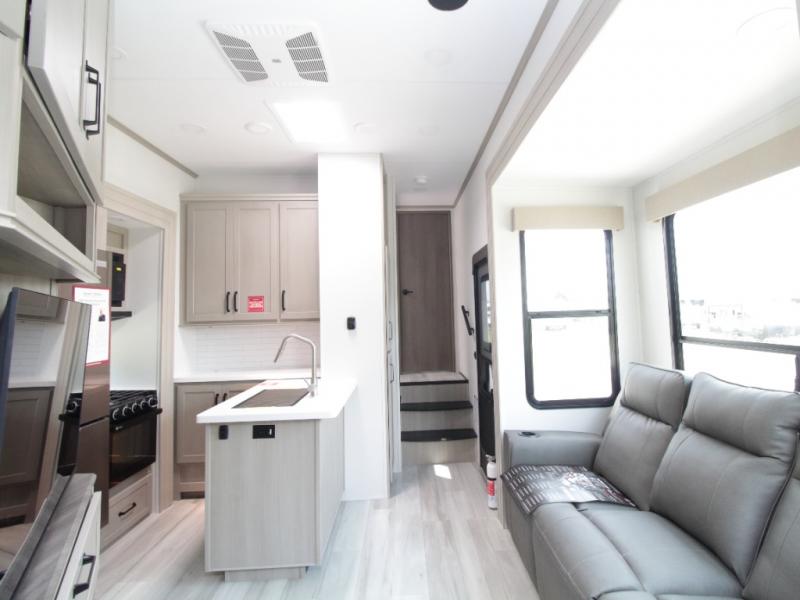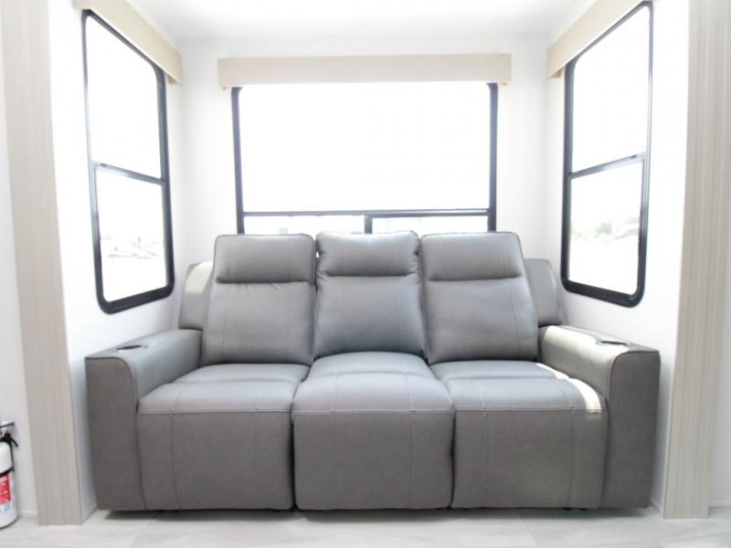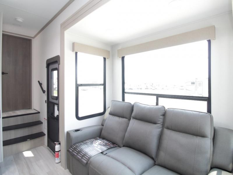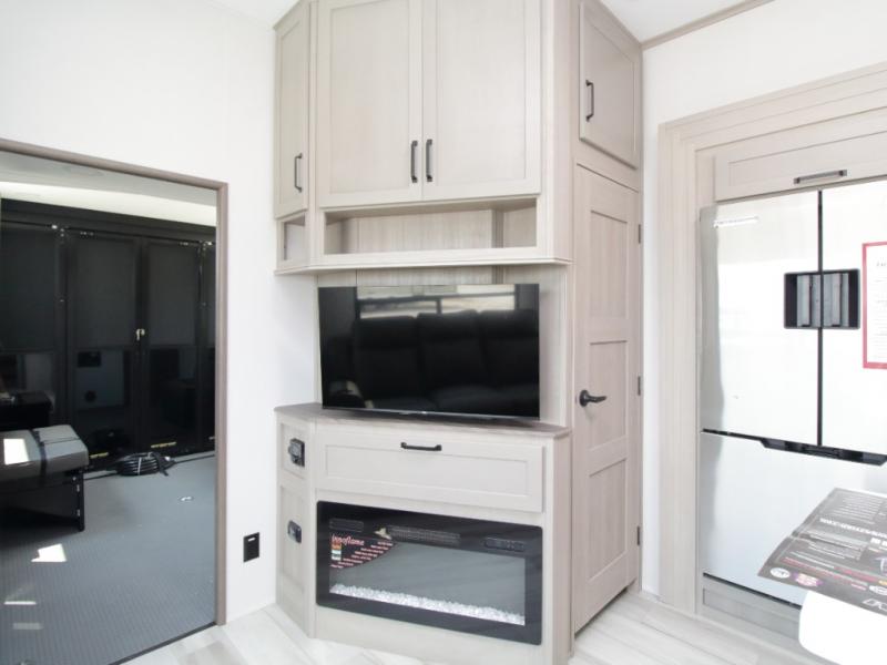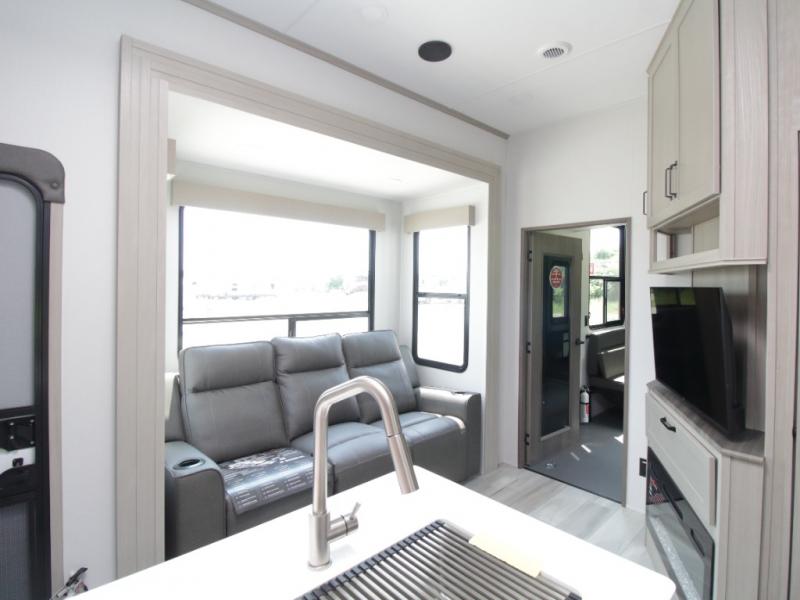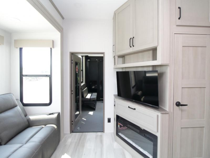 The main living space includes a fireplace, theater seating in a slide-out, and a fully equipped kitchen—making it easy to cook meals and relax after a day on the trails. Large panoramic windows bring in natural light, while residential cabinetry and quality finishes provide a warm, inviting feel.