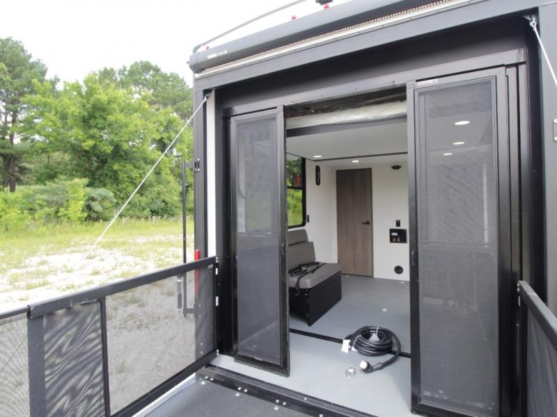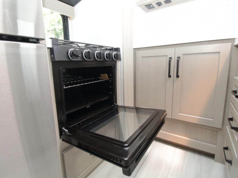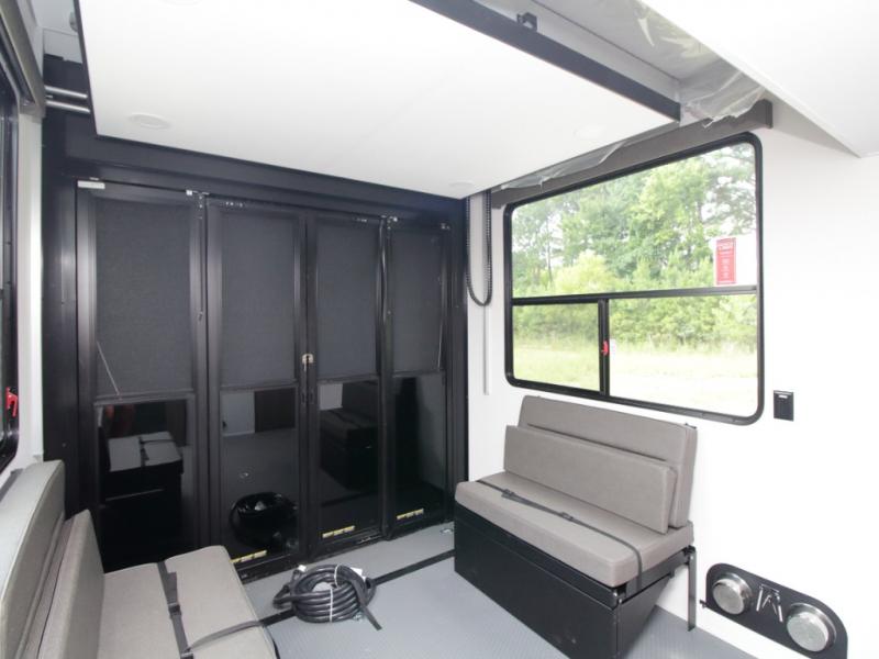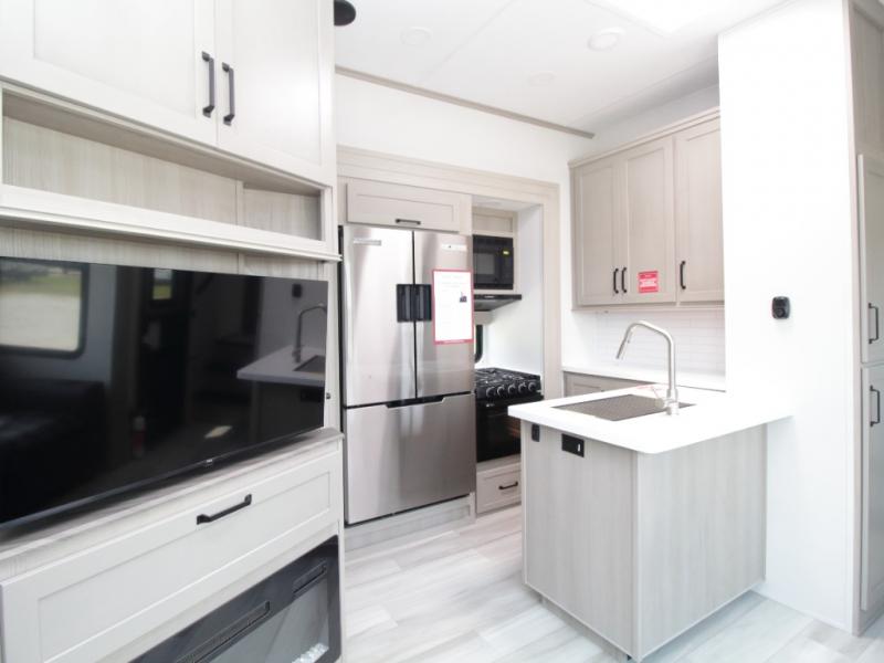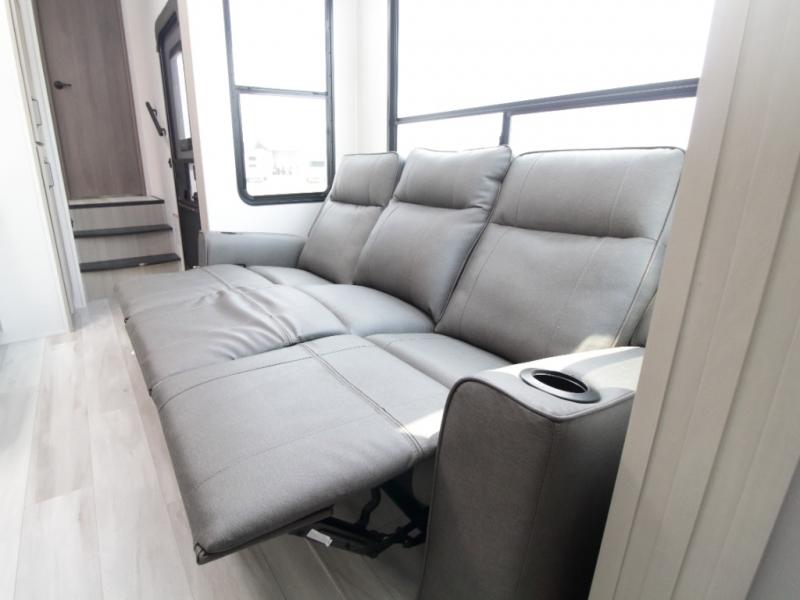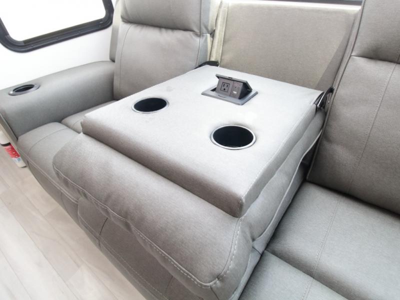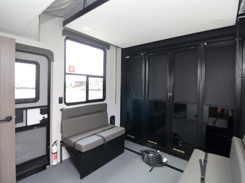 The main living space includes a fireplace, theater seating in a slide-out, and a fully equipped kitchen—making it easy to cook meals and relax after a day on the trails. Large panoramic windows bring in natural light, while residential cabinetry and quality finishes provide a warm, inviting feel.