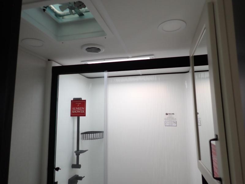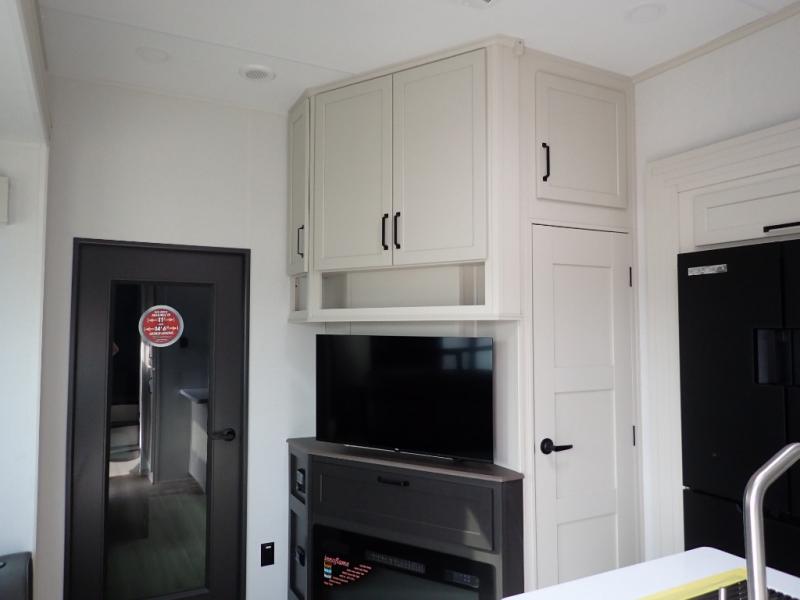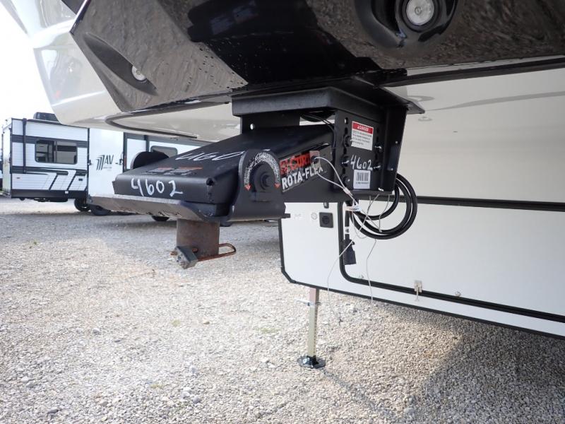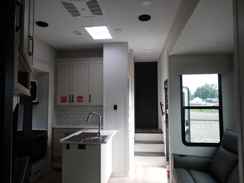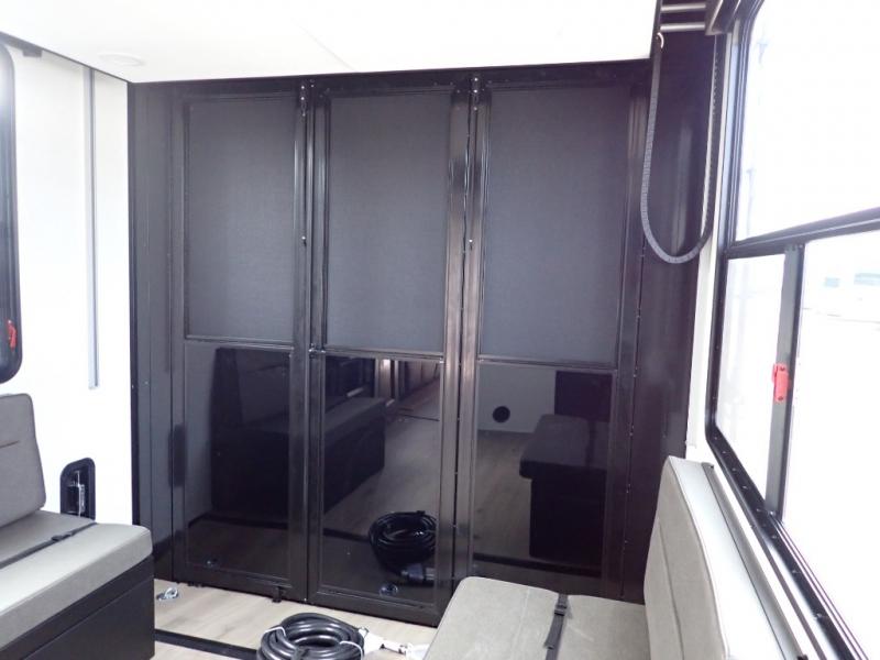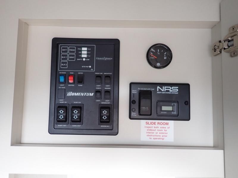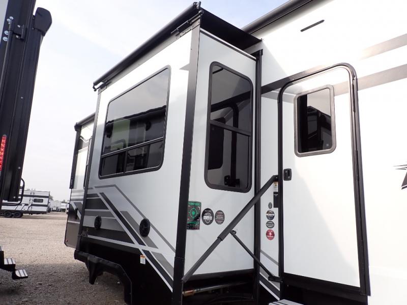 Optioned with: 3rd A/C, 6000 Generator, Momentum Garage Suite w/P2K Bed Lift, Rear Deck w/Power Awning, Generation III 3 Season Door w/Sliding Windows, Slideout Toppers, and 8K Axles with ABS Drum Brakes.