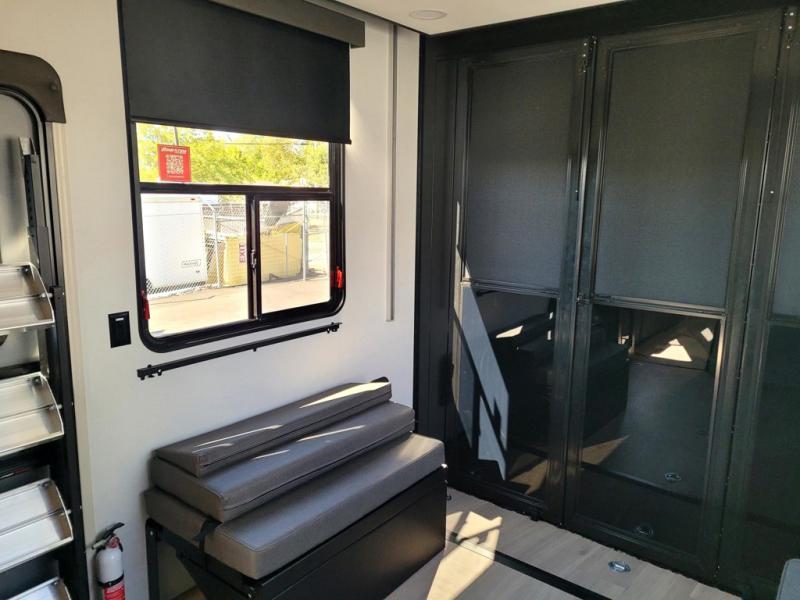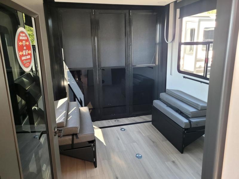 Are you looking forward to arriving at your destination, unloading your toys from an 11' separate garage, and heading out to the dunes? You can return to this Momentum G-Class toy hauler afterwards to find the convenience of having a full and half bath, two entry doors, and a loft bed. The rear ramp door can even be converted into a patio, plus there are exterior speakers to keep the party going! You will also appreciate the separate living area with a fireplace, theater seating slide, and full kitchen amenities. The front bedroom offers an escape to rest and relax for the next ride. Take a look outside and inside because you will be sold!