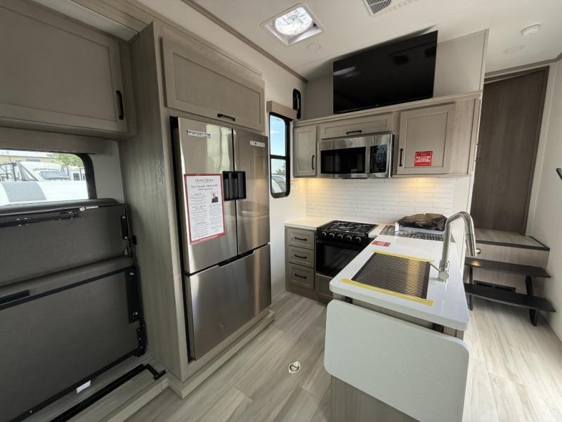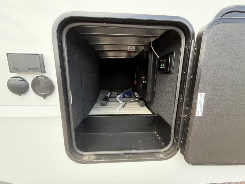 Load up your favorite off-road toys into the 15' garage area of this toy hauler! You will appreciate the convenience of having a full bathroom with a walk-in shower, the flip-up countertop extension in the kitchen, and flip-up pet dish. The rear ramp door can even be converted into a patio, plus there are exterior speakers to keep the party going. The rollover sofa and 15 cu. ft. refrigerator reside in a slide for more interior space as you prepare delicious meals in the fully equipped kitchen. The front private bedroom offers an escape to rest and relax on the queen bed for the next ride!