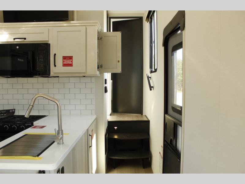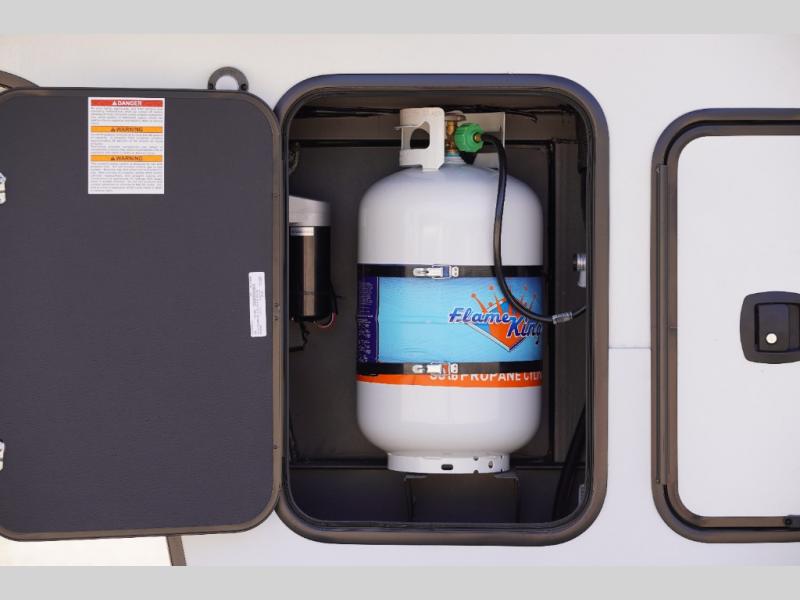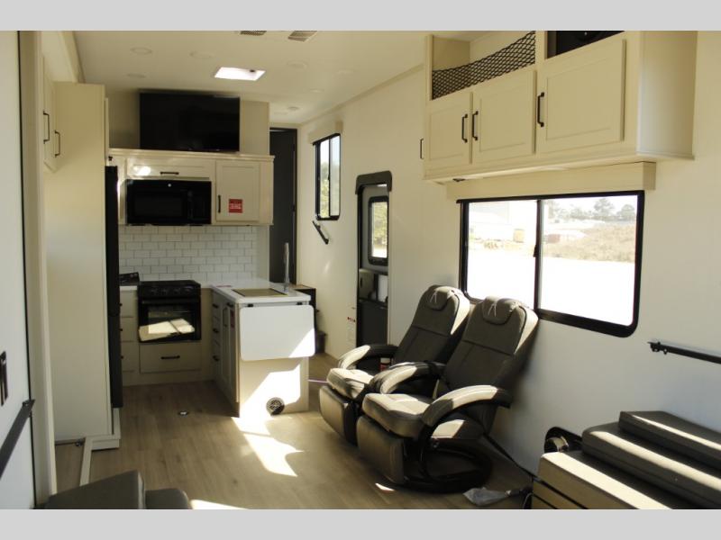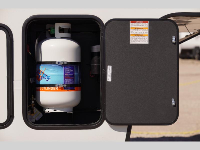 Load up your favorite off-road toys into the 15' garage area of this toy hauler! You will appreciate the convenience of having a full bathroom with a walk-in shower, the flip-up countertop extension in the kitchen, and flip-up pet dish. The rear ramp door can even be converted into a patio, plus there are exterior speakers to keep the party going. The rollover sofa and 15 cu. ft. refrigerator reside in a slide for more interior space as you prepare delicious meals in the fully equipped kitchen. The front private bedroom offers an escape to rest and relax on the queen bed for the next ride!
