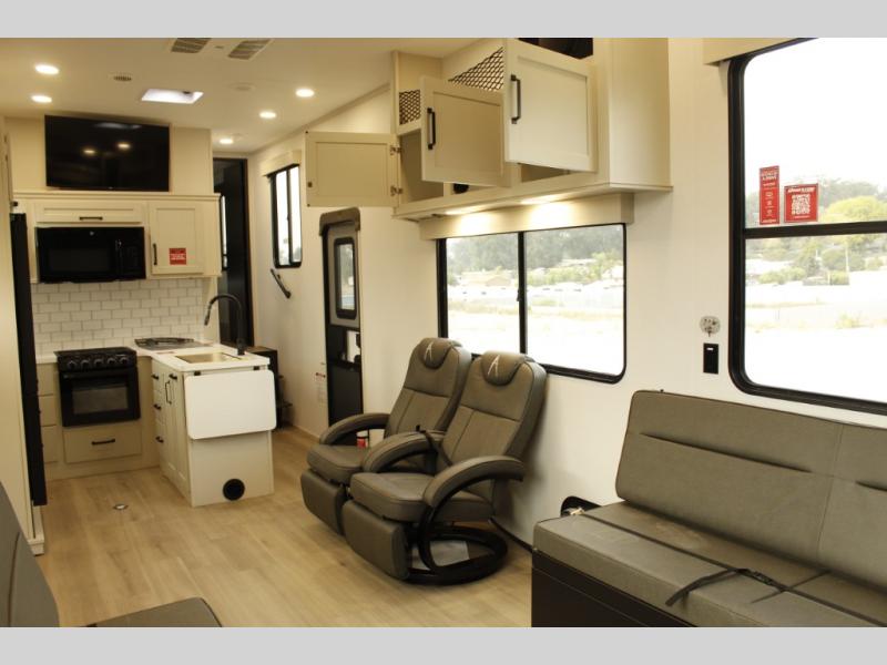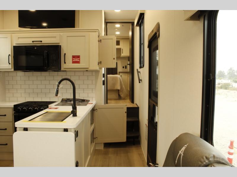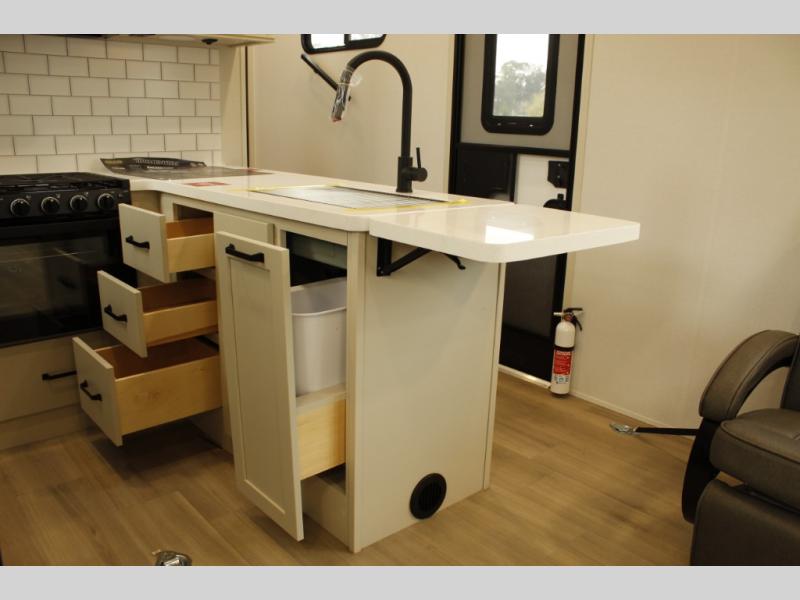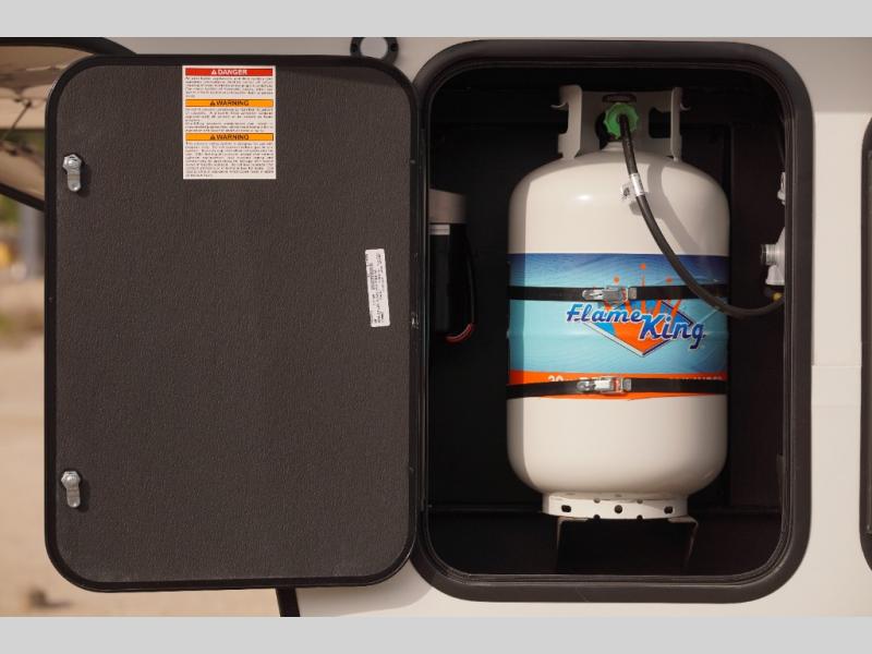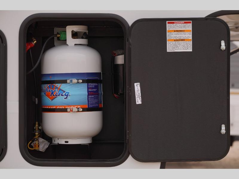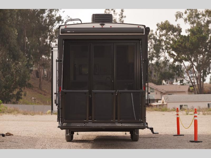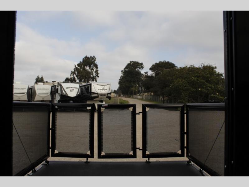 Load up your favorite off-road toys into the 15' garage area of this toy hauler! You will appreciate the convenience of having a full bathroom with a walk-in shower, the flip-up countertop extension in the kitchen, and flip-up pet dish. The rear ramp door can even be converted into a patio, plus there are exterior speakers to keep the party going. The rollover sofa and 15 cu. ft. refrigerator reside in a slide for more interior space as you prepare delicious meals in the fully equipped kitchen. The front private bedroom offers an escape to rest and relax on the queen bed for the next ride!