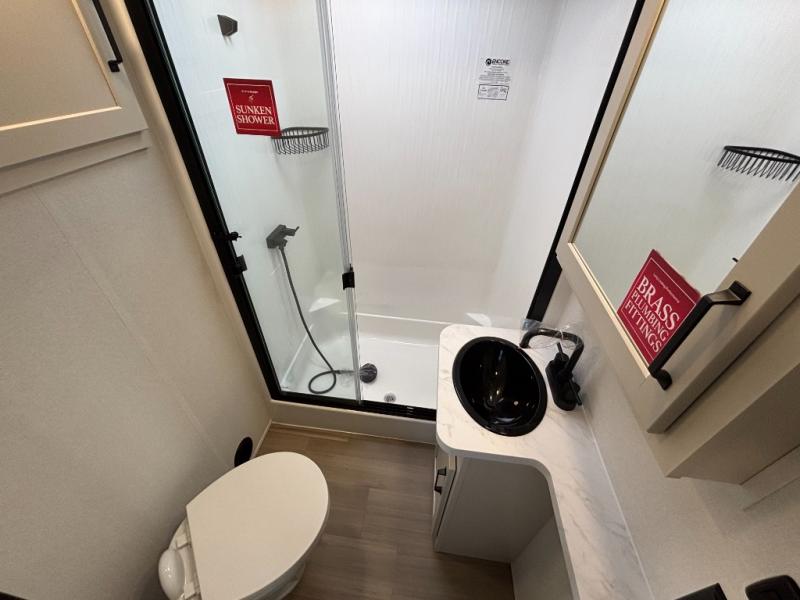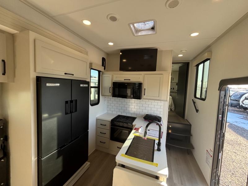 Load up your favorite off-road toys into the 15' garage area of this toy hauler! You will appreciate the convenience of having a full bathroom with a walk-in shower, the flip-up countertop extension in the kitchen, and flip-up pet dish. The rear ramp door can even be converted into a patio, plus there are exterior speakers to keep the party going. The rollover sofa and 15 cu. ft. refrigerator reside in a slide for more interior space as you prepare delicious meals in the fully equipped kitchen. The front private bedroom offers an escape to rest and relax on the queen bed for the next ride!