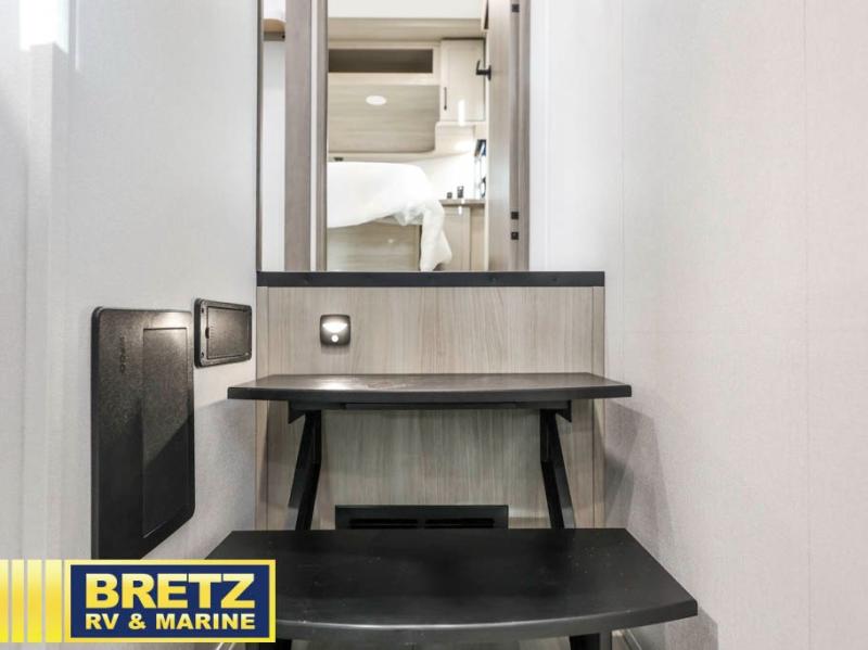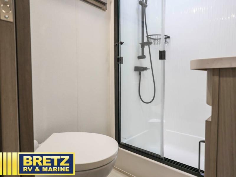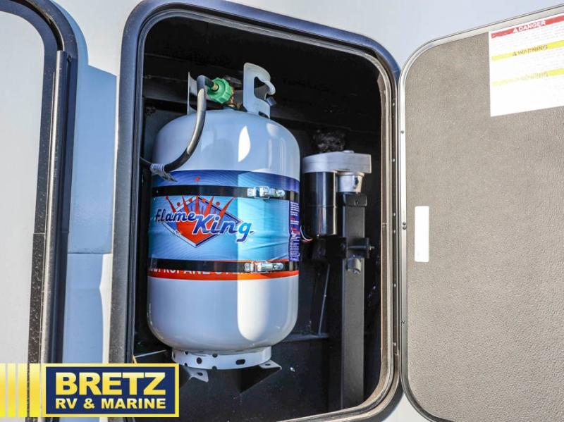 Load up your favorite off-road toys into the 15' garage area of this toy hauler! You will appreciate the convenience of having a full bathroom with a walk-in shower, the flip-up countertop extension in the kitchen, and flip-up pet dish. The rear ramp door can even be converted into a patio, plus there are exterior speakers to keep the party going. The rollover sofa and 15 cu. ft. refrigerator reside in a slide for more interior space as you prepare delicious meals in the fully equipped kitchen. The front private bedroom offers an escape to rest and relax on the queen bed for the next ride!