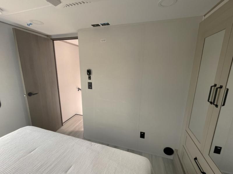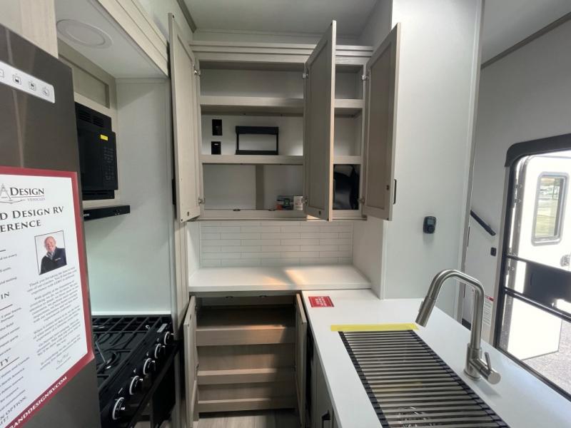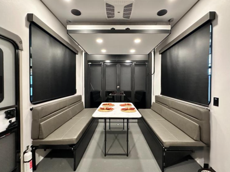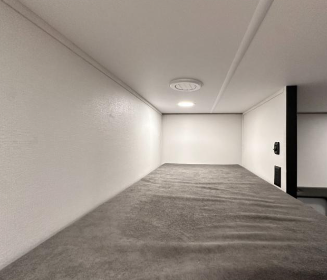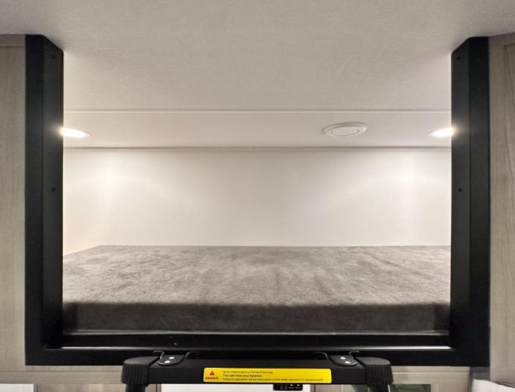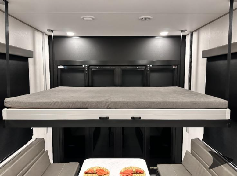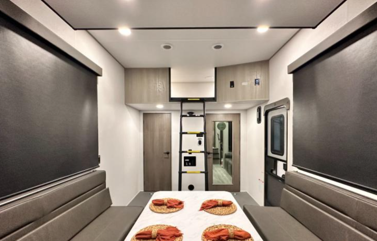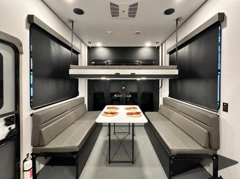 Inside, relax in style with theater seating, a built in fireplace, and a fully equipped kitchen perfect for home cooked meals. A full bath with a walk in shower keeps you refreshed after a day on the trails, and the private master bedroom offers plenty of storage with overhead cabinets and a wardrobe slide.