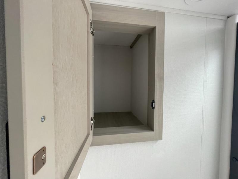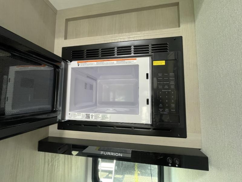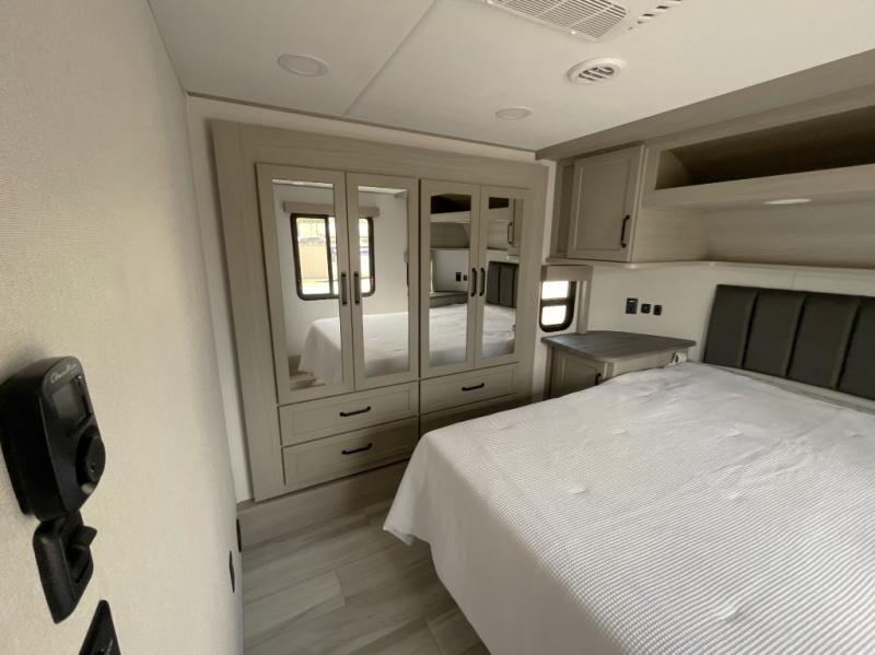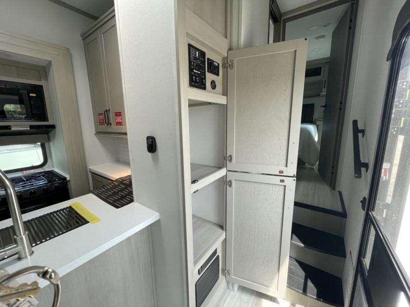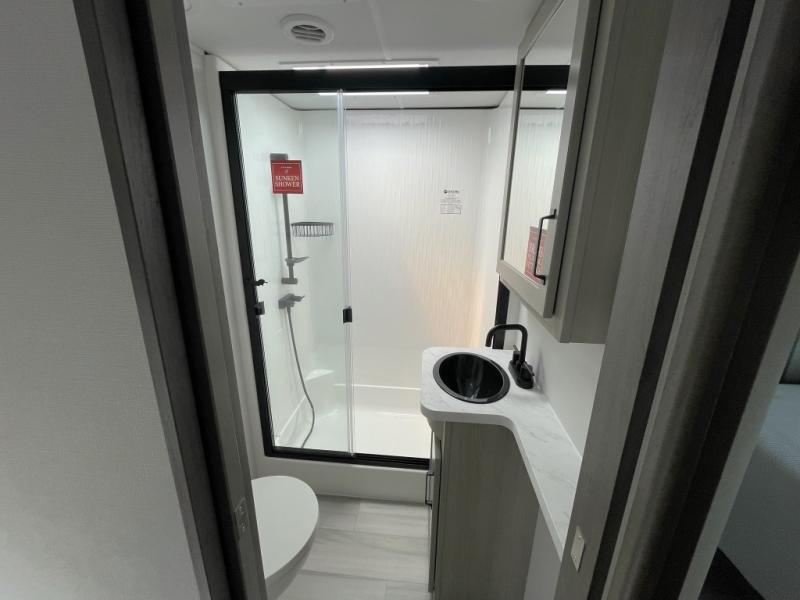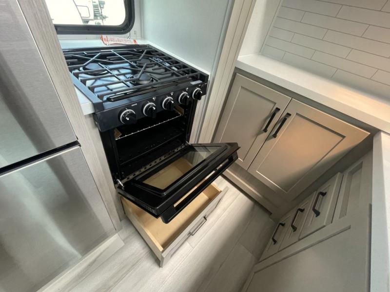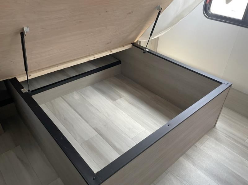 Inside, relax in style with theater seating, a built in fireplace, and a fully equipped kitchen perfect for home cooked meals. A full bath with a walk in shower keeps you refreshed after a day on the trails, and the private master bedroom offers plenty of storage with overhead cabinets and a wardrobe slide.