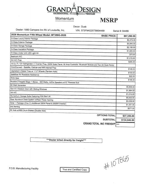 New 2026 Grand Design Momentum G-Class 350G Toy Hauler Fifth Wheel