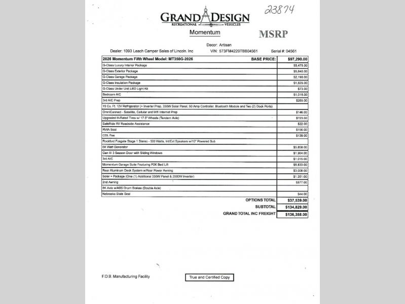 New 2026 Grand Design Momentum G-Class 350G Toy Hauler Fifth Wheel