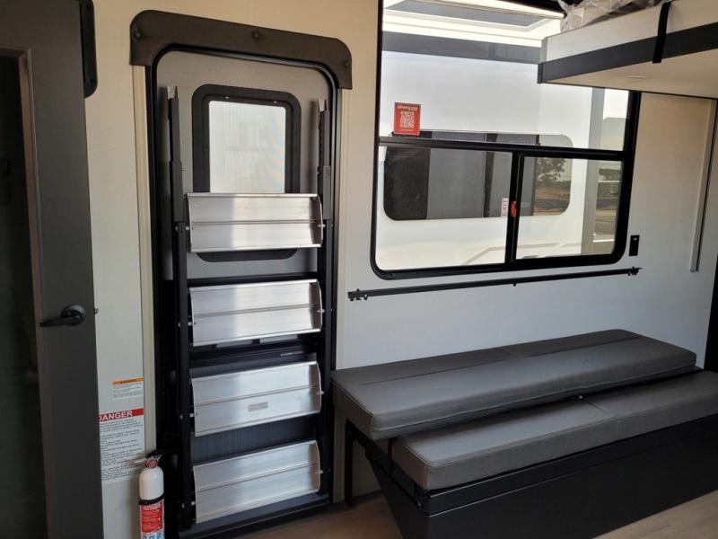 Just imagine the fun you will have with this Momentum G-Class toy hauler set up at any off-road park. With the 14' 6" separate garage that includes a half bath, a second exterior entry door, and a loft, you will have your own area to do what you like. The rear ramp door can even be converted into a patio if you need more outdoor living space. The main living area offers a fireplace, theater seating, and kitchen appliances to make delicious home cooked meals. You will also be able to stay clean and ready for the next ride with the walk-in shower in the full bathroom, and the front master bedroom has plenty of storage for clothing with the wardrobe slide and overhead cabinets.