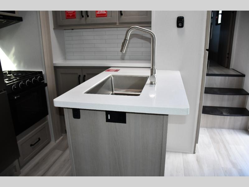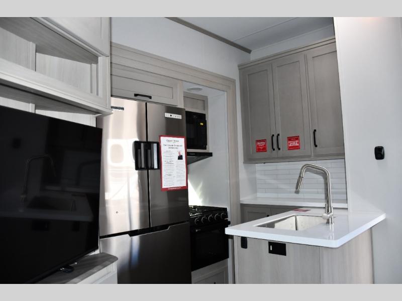 The fully equipped galley includes solid-surface countertops, a spacious refrigerator, microwave, oven, range, and deep stainless steel sink—perfect for prepping meals after the trail.
